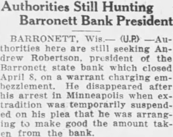 Authorities Still Hunting Barronett Bank President BARRONETT. (U.P.) here are Andrew president the Barronett state bank which closed April on charging embezzlement. He disappeared after his arrest in Minneapolis when extradition temporarily suspended on his plea that he arranging to make good the amount en from the bank.