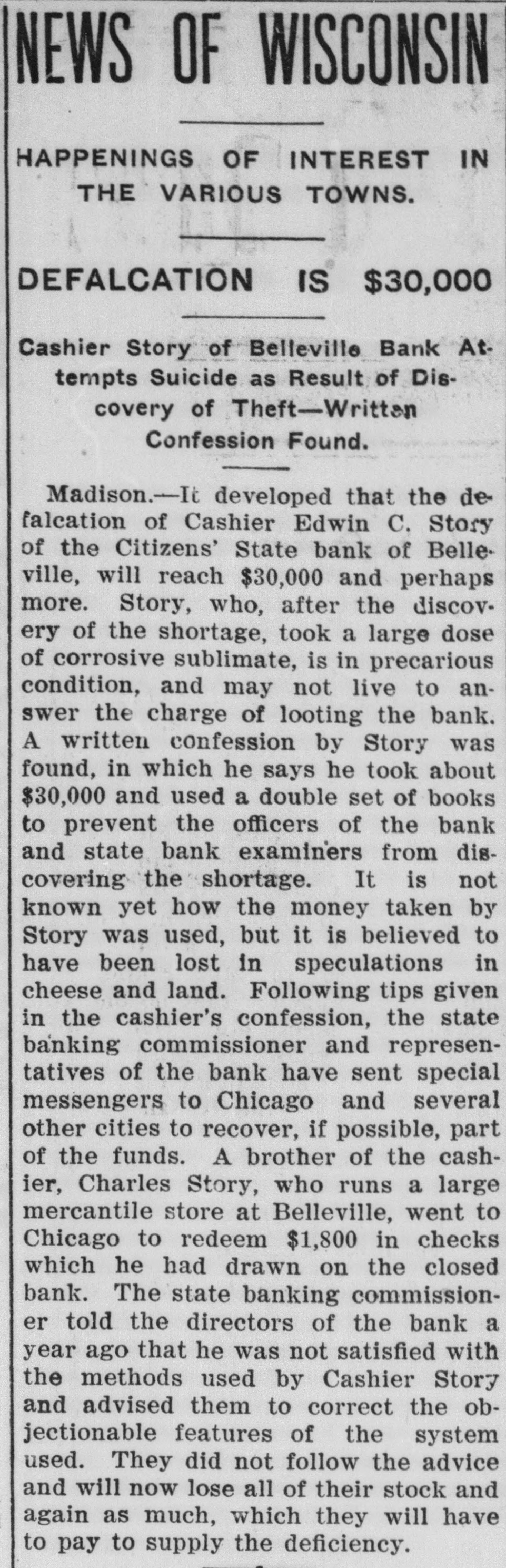 NEWS OF WISCONSIN HAPPENINGS OF INTEREST IN THE VARIOUS TOWNS. DEFALCATION IS $30,000 Cashier Story of Belleville Bank Attempts Suicide as Result of Discovery of Theft-Written Confession Found. Madison.-It developed that the defalcation of Cashier Edwin C. Story of the Citizens' State bank of Belleville, will reach $30,000 and perhaps more. Story, who, after the discovery of the shortage, took a large dose of corrosive sublimate, is in precarious condition, and may not live to answer the charge of looting the bank. A written confession by Story was found, in which he says he took about $30,000 and used a double set of books to prevent the officers of the bank and state bank examiners from discovering the shortage. It is not known yet how the money taken by Story was used, but it is believed to have been lost in speculations in cheese and land. Following tips given in the cashier's confession, the state banking commissioner and representatives of the bank have sent special messengers to Chicago and several other cities to recover, if possible, part of the funds. A brother of the cashier, Charles Story, who runs a large mercantile store at Belleville, went to Chicago to redeem $1,800 in checks which he had drawn on the closed bank. The state banking commissioner told the directors of the bank a year ago that he was not satisfied with the methods used by Cashier Story and advised them to correct the objectionable features of the system used. They did not follow the advice and will now lose all of their stock and again as much, which they will have to pay to supply the deficiency.