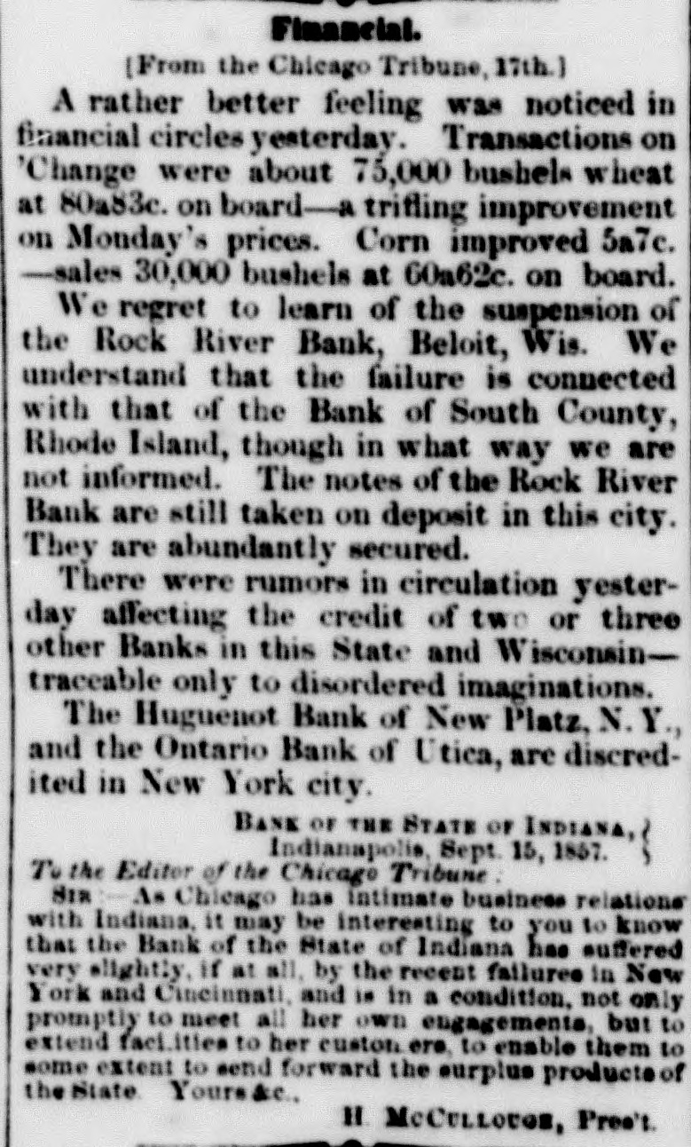 Financial. [From the Chicago Tribune, 17th.) A rather better feeling was noticed in financial circles yesterday. Transactions on 'Change were about 75,000 bushels wheat at 80a83c. on board-a trifling improvement on Monday's prices. Corn improved 5a7c. -sales 30,000 bushels at 60a62c. on board. We regret to learn of the suspension of the Rock River Bank, Beloit, Wis. We understand that the failure is connected with that of the Bank of South County, Rhode Island, though in what way we are not informed. The notes of the Rock River Bank are still taken on deposit in this city. They are abundantly secured. There were rumors in circulation yesterday affecting the credit of two or three other Banks in this State and Wisconsintraceable only to disordered imaginations. The Huguenot Bank of New Platz, N.Y., and the Ontario Bank of Utica, are discredited in New York city. BANK OF THE STATE OF INDIANA, Indianapolis, Sept. 15, 1857. } To the Editor of the Chicago Tribune: Stx As Chicago has intimate business relations with Indiana, it may be interesting to you to know that the Bank of the State of Indiana has suffered very elightly, if at all, by the recent failures in New York and Cincinnati, and is in a condition, not only promptly to meet all her own engagements, but to extend facilities to her custon ere, to enable them to some extent to send forward the eurplus products of the State Yours&e., II. McCULLOVER, Pree't.