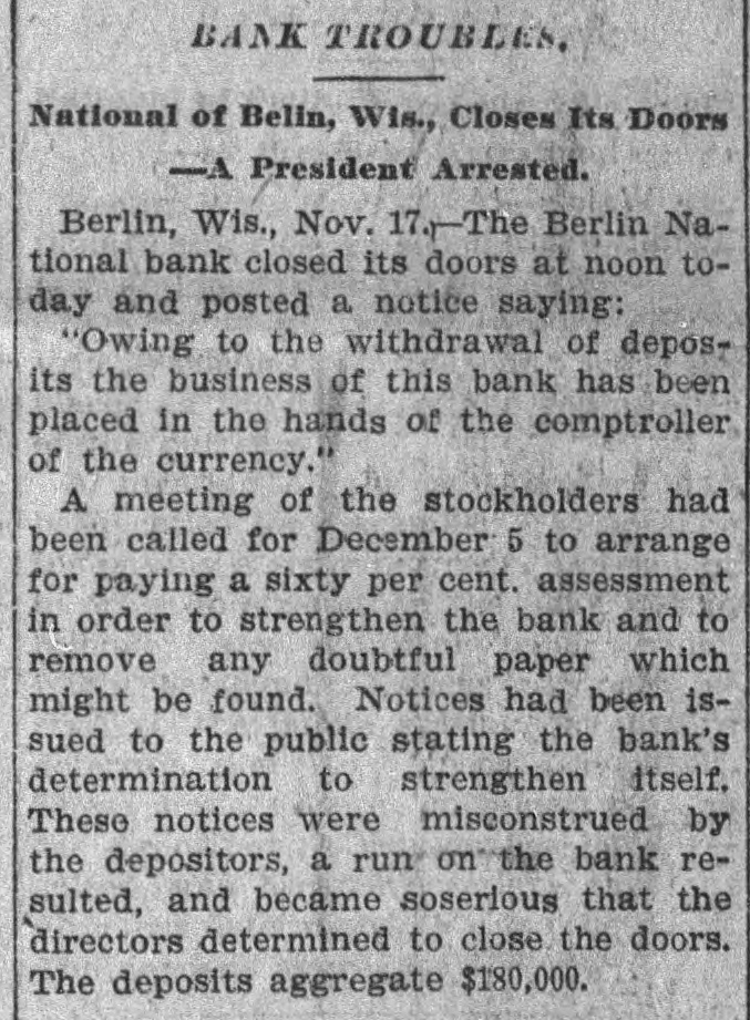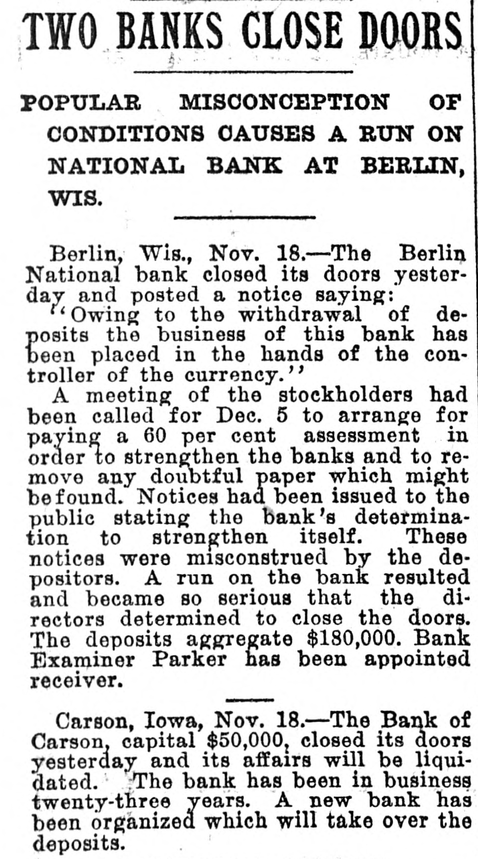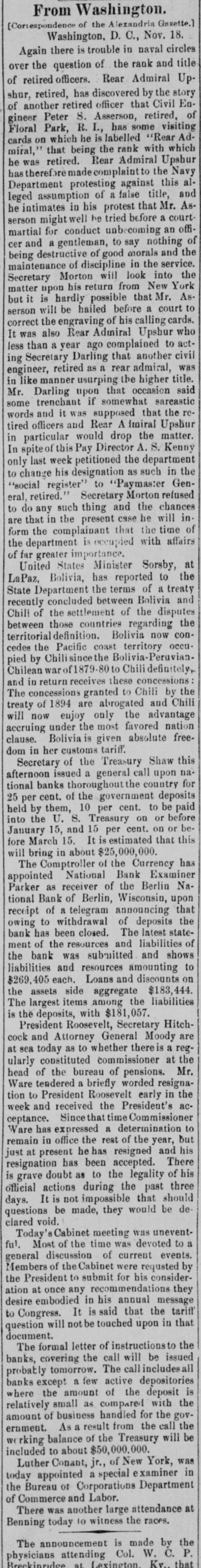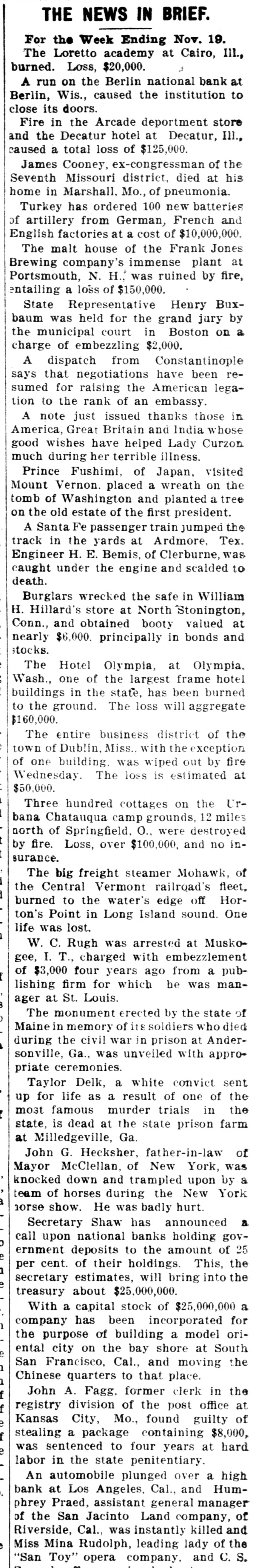 THE NEWS IN BRIEF. For the Week Ending Nov. 19. The Loretto academy at Cairo, III., burned. Loss, $20,000. A run on the Berlin national bank at Berlin, Wis., caused the institution to close its doors. Fire in the Arcade deportment store and the Decatur hotel at Decatur, Ill., caused a total loss of $125,000. James Cooney, ex-congressman of the Seventh Missouri district, died at his home in Marshall. Mo., of pneumonia. Turkey has ordered 100 new batteries of artillery from German, French and English factories at a cost of $10,000,000. The malt house of the Frank Jones Brewing company's immense plant at Portsmouth, N. H., was ruined by fire, entailing a loss of $150,000. State Representative Henry Buxbaum was held for the grand jury by the municipal court in Boston on a charge of embezzling $2,000. A dispatch from Constantinople says that negotiations have been resumed for raising the American legation to the rank of an embassy. A note just issued thanks those in America, Great Britain and India whose good wishes have helped Lady Curzon much during her terrible illness. Prince Fushimi, of Japan, visited Mount Vernon. placed a wreath on the tomb of Washington and planted a tree on the old estate of the first president. A Santa Fe passenger train jumped the track in the yards at Ardmore, Tex. Engineer H. E. Bemis, of Clerburne, was caught under the engine and scalded to death. Burglars wrecked the safe in William H. Hillard's store at North Stonington, Conn., and obtained booty valued at nearly $6,000. principally in bonds and stocks. The Hotel Olympia, at Olympia. Wash., one of the largest frame hotel buildings in the state, has been burned to the ground. The loss will aggregate $160,000. The entire business district of the town of Dublin, Miss.. with the exception of one building. was wiped out by fire Wednesday. The loss is estimated at $50,000. Three hundred cottages on the Urbana Chatauqua camp grounds, 12 miles north of Springfield, O., were destroyed by fire. Loss, over $100,000, and no insurance. The big freight steamer Mohawk, of the Central Vermont railroad's fleet, burned to the water's edge off Horton's Point in Long Island sound. One life was lost. W. C. Rugh was arrested at Muskogee, I. T., charged with embezzlement of $3,000 four years ago from a publishing firm for which he was manager at St. Louis. The monument erected by the state of Maine in memory of its soldiers who died during the civil war in prison at Andersonville, Ga., was unveiled with appropriate ceremonies. Taylor Delk, a white convict sent up for life as a result of one of the most famous murder trials in the state, is dead at the state prison farm at Milledgeville, Ga. John G. Hecksher, father-in-law of Mayor McClellan, of New York, was knocked down and trampled upon by a team of horses during the New York norse show. He was badly hurt. Secretary Shaw has announced a call upon national banks holding government deposits to the amount of 25 per cent. of their holdings. This, the secretary estimates, will bring into the treasury about $25,000,000. With a capital stock of $25,000,000 a company has been incorporated for the purpose of building a model oriental city on the bay shore at South San Francisco, Cal., and moving the Chinese quarters to that place. John A. Fagg, former clerk in the registry division of the post office at Kansas City, Mo., found guilty of stealing a package containing $8,000, was sentenced to four years at hard labor in the state penitentiary. An automobile plunged over a high bank at Los Angeles Cal and Hum-
