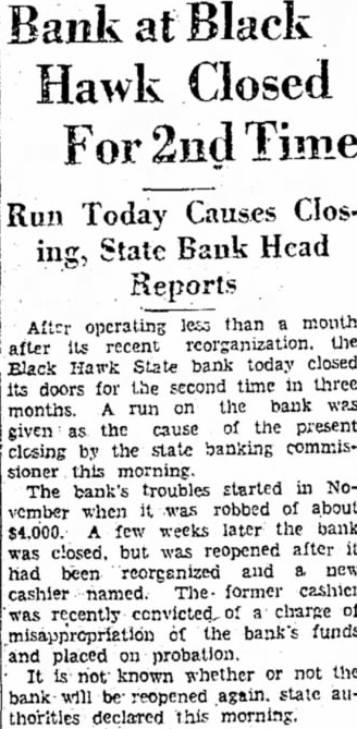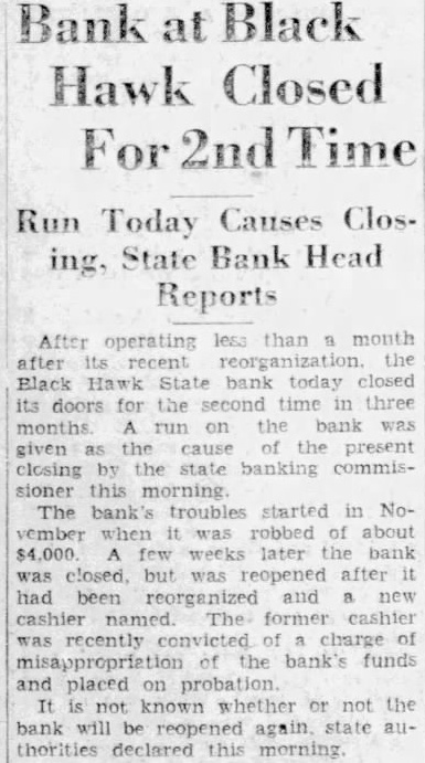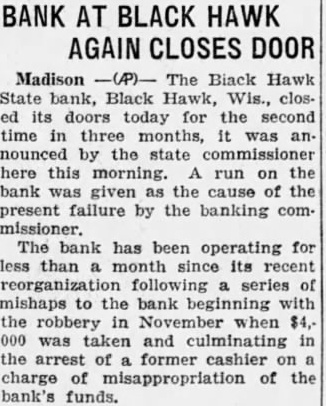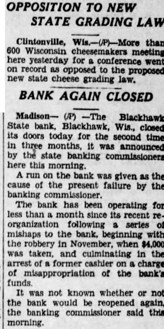 OPPOSITION TO NEW STATE GRADING LAW Clintonville, than 600 Wisconsin cheesemakers here yesterday conference went on record opposed the proposed new state cheese grading law. BANK AGAIN CLOSED (AP) Blackhawk State bank, Blackhawk, Wis., closed its doors today for the second time in three months, it was by state banking commissioners here this run the given the cause of the present failure by the The bank has been operating for than month since its recent organization following series mishaps to the bank. beginning with the robbery in November, when $4,000 was taken, and culminating in the arrest former cashier charge of of the bank's funds was not known whether or not the bank would be reopened again, the banking commissioner said this morning.