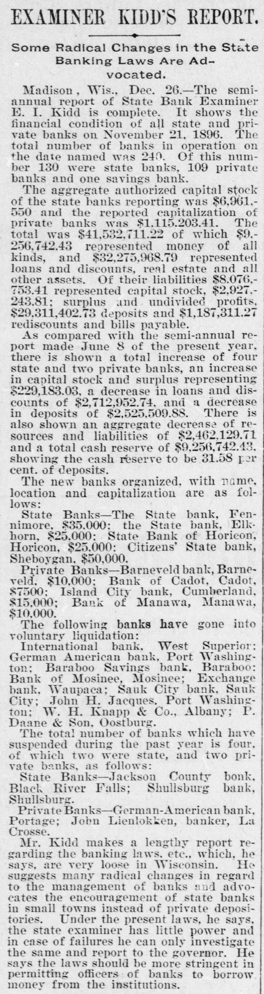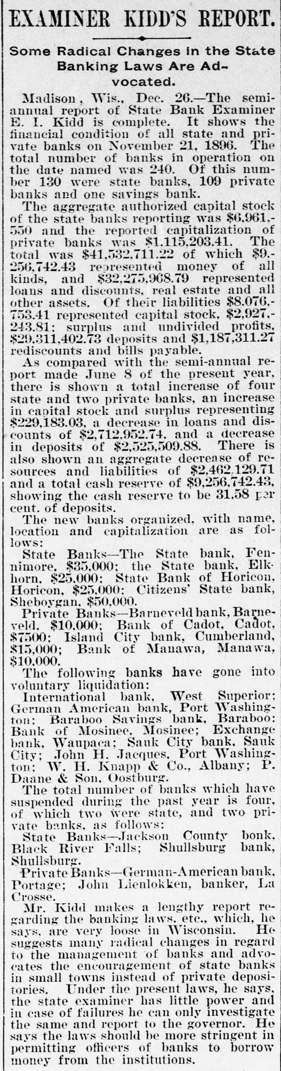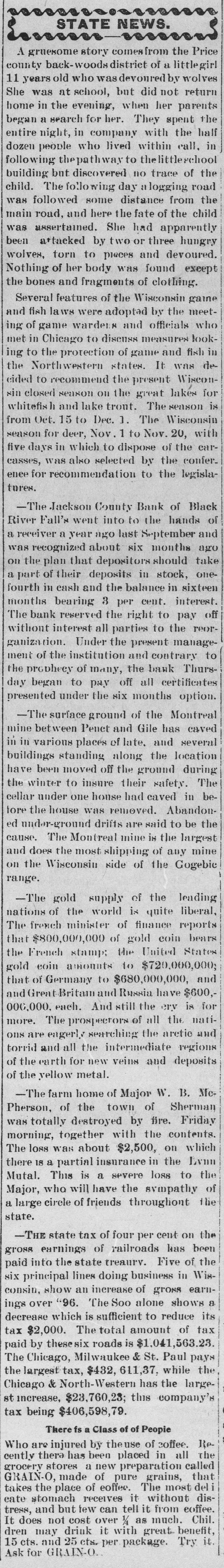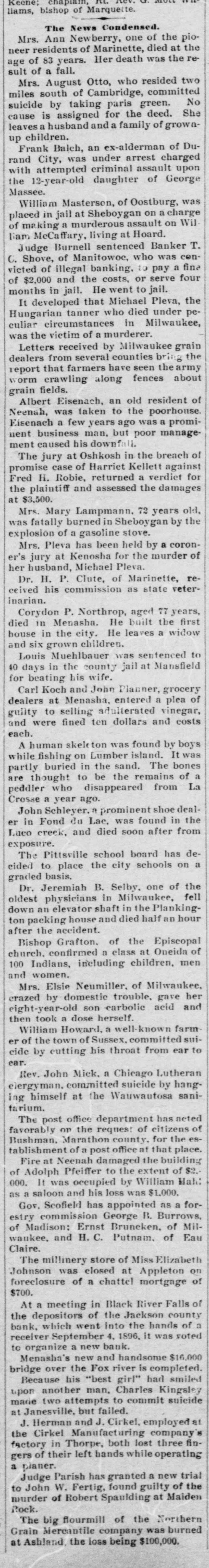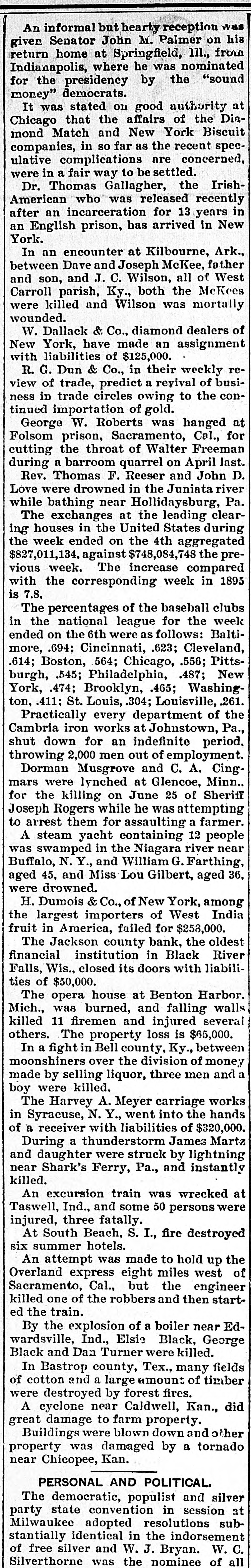 An informal but hearty reception was given Senator John M. Palmer on his return home at Springfield, 111., from Indianapolis, where he was nominated for the presidency by the "sound money" democrats. It was stated on good authority at Chicago that the affairs of the Diamond Match and New York Biscuit companies, in so far as the recent speculative complications are concerned, were in a fair way to be settled. Dr. Thomas Gallagher, the IrishAmerican who was released recently after an incarceration for 13 years in an English prison, has arrived in New York. In an encounter at Kilbourne, Ark., between Dave and Joseph McKee, father and son, and J. C. Wilson, all of West Carroll parish, Ky., both the McKees were killed and Wilson was mortally wounded. W. Dallack & Co., diamond dealers of New York, have made an assignment with liabilities of $125,000. R. G. Dun & Co., in their weekly review of trade, predict a revival of business in trade circles owing to the continued importation of gold. George W. Roberts was hanged at Folsom prison, Sacramento, Cal., for cutting the throat of Walter Freeman during a barroom quarrel on April last. Rev. Thomas F. Reeser and John D. Love were drowned in the Juniata river while bathing near Hollidaysburg, Pa. The exchanges at the leading clearing houses in the United States during the week ended on the 4th aggregated $827,011,134. against $748,084,748 the previous week. The increase compared with the corresponding week in 1895 is 7.8. The percentages of the baseball clubs in the national league for the week ended on the 6th were as follows: Baltimore, .694; Cincinnati, .623; Cleveland, .614; Boston, 564; Chicago, .556; Pittsburgh, .545; Philadelphia, .487; New York, .474; Brooklyn, .465; Washington, .411; St. Louis, .304; Louisville, 261. Practically every department of the Cambria iron works at Johnstown, Pa., shut down for an indefinite period, throwing 2,000 men out of employment. Dorman Musgrove and C. A. Cingmars were lynched at Glencoe, Minn., for the killing on June 25 of Sheriff Joseph Rogers while he was attempting to arrest them for assaulting a farmer. A steam yacht containing 12 people was swamped in the Niagara river near Buffalo, N.Y., and William G. Farthing, aged 45, and Miss Lou Gilbert, aged 36, were drowned. H. Dumois & Co., of New York, among the largest importers of West India fruit in America, failed for $253,000. The Jackson county bank, the oldest financial institution in Black River Falls, Wis., closed its doors with liabilities of $50,000. The opera house at Benton Harbor. Mich., was burned, and falling walls killed 11 firemen and injured several others. The property loss is $65,000. In a fight in Bell county, Ky., between moonshiners over the division of money made by selling liquor, three men and a boy were killed. The Harvey A. Meyer carriage works in Syracuse, N. Y., went into the hands of a receiver with liabilities of $320,000. During a thunderstorm James Martz and daughter were struck by lightning near Shark's Ferry, Pa., and instantly killed. An excursion train was wrecked at Taswell, Ind., and some 50 persons were injured, three fatally. At South Beach, S. I., fire destroyed six summer hotels. An attempt was made to hold up the Overland express eight miles west of Sacramento, Cal., but the engineer killed one of the robbers and then started the train. By the explosion of a boiler near Edwardsville, Ind., Elsie Black, George Black and Dan Turner were killed. In Bastrop county, Tex., many fields of cotton and a large amount of timber were destroyed by forest fires. A cyclone near Caldwell, Kan., did great damage to farm property. Buildings were blown down and other property was damaged by a tornado near Chicopee, Kan. PERSONAL AND POLITICAL. The democratic, populist and silver party state convention in session at Milwaukee adopted resolutions substantially identical in the indorsement of free silver and W. J. Bryan. W. C. Silverthorne was the nominee of all