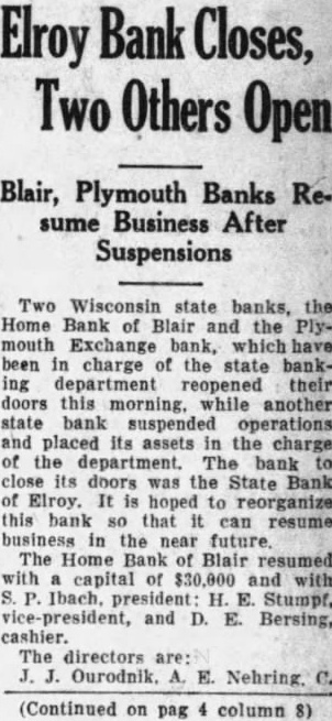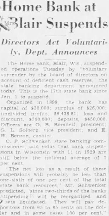 Home Bank at Blair Suspends Directors Act Voluntarily, Dept. Announces The Home bank, Blair Wis suspended operations Tuesday by "voluntary surrender by the board of directors on account of cash reserves the state banking department announced today This the 17th state bank since Jan to suspend Organized 1899 the bank has capital of $30,000 surplus of $26,000 profits 438 loss and discount $500,000 deposits $450,000 Officers are O. B. Borsheif president G Solberg president and E Benson cashier Scowenker state banking missioner said today that bank suspen sions in Wisconsin with in 1929 are still below the national average of per cent The net loss as result of these suspensions will probably be less than one-sixth of one per of the total state bank resources Mr. Schwenker predicted, since two-thirds of the banks will be reorganized and sets liquidated They pay depositors from 65 85 cents on the dolJar and in some cases 100 per cent.