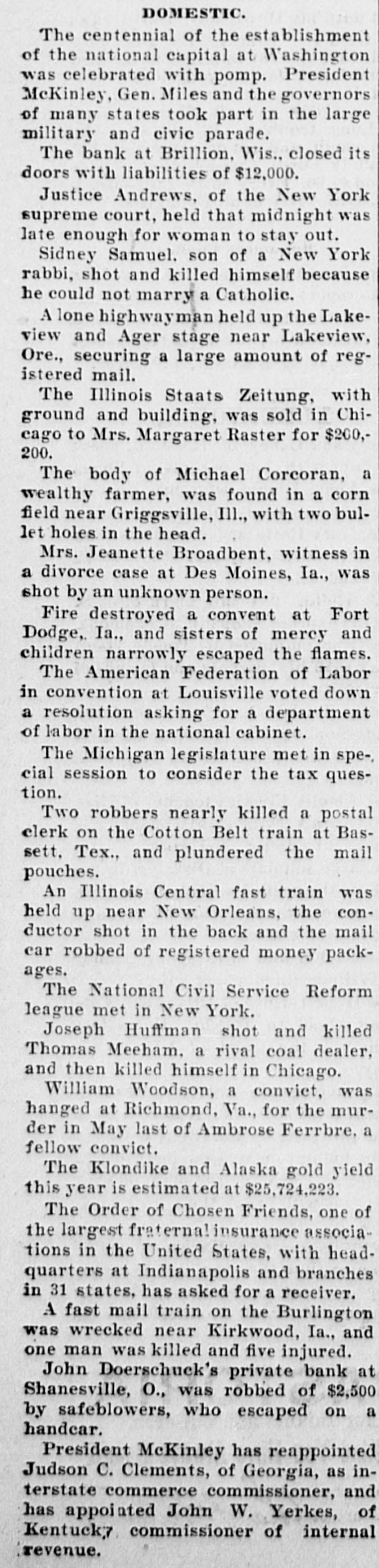 DOMESTIC. The centennial of the establishment of the national capital at Washington was celebrated with pomp. President McKinley, Gen. Miles and the governors of many states took part in the large military and civic parade. The bank at Brillion. Wis., closed its doors with liabilities of $12,000. Justice Andrews. of the New York supreme court, held that midnight was late enough for woman to stay out. Sidney Samuel. son of a New York rabbi, shot and killed himself because he could not marry a Catholic. A lone highwayman held up the Lakeview and Ager stage near Lakeview, Ore., securing a large amount of registered mail. The Illinois Staats Zeitung, with ground and building, was sold in Chicago to Mrs. Margaret Raster for $200,200. The body of Michael Corcoran, a wealthy farmer, was found in a corn field near Griggsville, Ill., with two bullet holes in the head. Mrs. Jeanette Broadbent, witness in a divorce case at Des Moines, Ia., was shot by an unknown person. Fire destroyed a convent at Fort Dodge, Ia., and sisters of mercy and children narrowly escaped the flames. The American Federation of Labor in convention at Louisville voted down a resolution asking for a department of labor in the national cabinet. The Michigan legislature met in spe-, cial session to consider the tax question. Two robbers nearly killed a postal clerk on the Cotton Belt train at Bassett. Tex., and plundered the mail pouches. An Illinois Central fast train was held up near New Orleans, the conductor shot in the back and the mail car robbed of registered money packages. The National Civil Service Reform league met in New York. Joseph Huffman shot and killed Thomas Meeham. a rival coal dealer, and then killed himself in Chicago. William Woodson, a convict, was hanged at Richmond, Va., for the murder in May last of Ambrose Ferrbre, a fellow convict. The Klondike and Alaska gold yield this year is estimated at $25,724,223. The Order of Chosen Friends, one of the largest fraterna! insurance associations in the United States, with headquarters at Indianapolis and branches in 31 states, has asked for a receiver. A fast mail train on the Burlington was wrecked near Kirkwood, Ia., and one man was killed and five injured. bank at was robbed of Shanesville, John Doerschuck's O., private $2,500 by safeblowers, who escaped on a handcar. President McKinley has reappointed Judson C. Clements, of Georgia, as interstate commerce commissioner, and has appointed John W. Yerkes, of Kentucky commissioner of internal revenue.