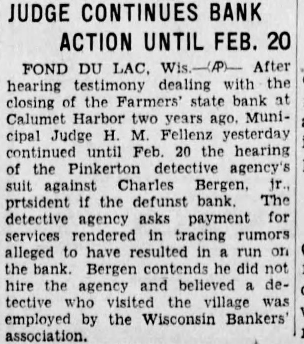JUDGE CONTINUES BANK ACTION UNTIL FEB. 20 FOND DU After hearing dealing with the closing the Farmers' state bank Calumet Harbor years Municipal Judge Fellenz yesterday continued until hearing the agency's against Charles Bergen, prtsident the defunst bank detective agency asks payment for services rumors alleged resulted in the did agency and tective the village was employed by the Wisconsin Bankers' association.