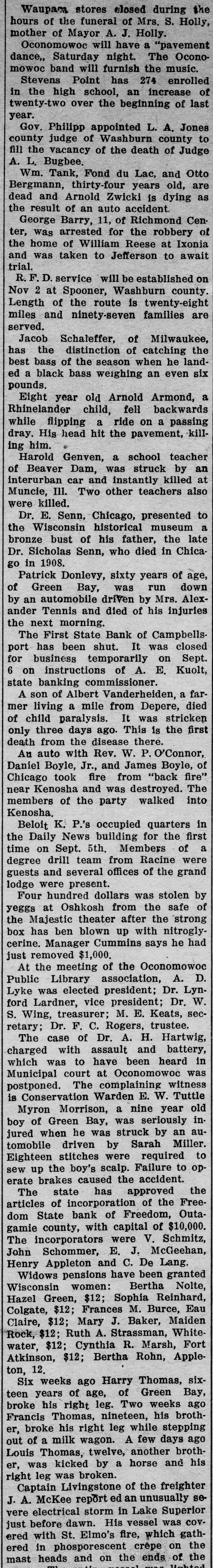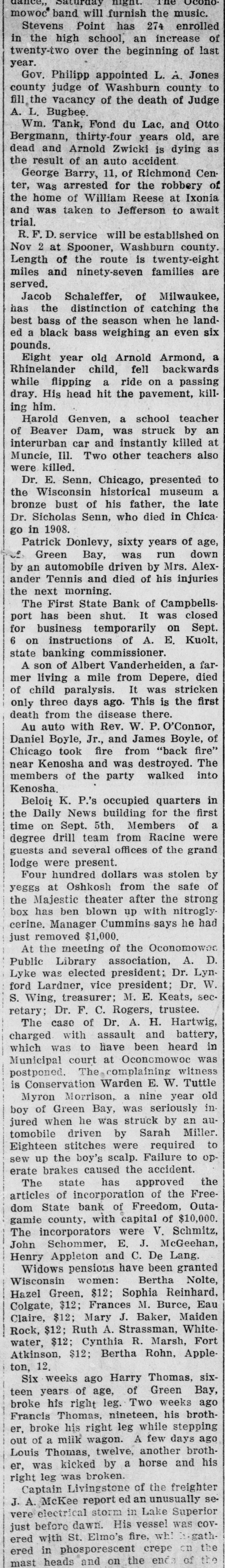 Saturday night. Oconomowoc® band will furnish the music. Stevens Point has 274 enrolled in the high school, an increase of twenty-two over the beginning of last year. Gov. Philipp appointed L. A. Jones county judge of Washburn county to fill, the vacancy of the death of Judge A. L. Bugbee. Wm. Tank, Fond du Lac, and Otto Bergmann, thirty-four years old, are dead and Arnold Zwicki is dying as the result of an auto accident George Barry, 11, of Richmond Center, was arrested for the robbery of the home of William Reese at Ixonia and was taken to Jefferson to await trial. R. F. D. service will be established on Nov 2 at Spooner, Washburn county. Length of the route is twenty-eight miles and ninety-seven families are served. Jacob Schaleffer, of Milwaukee, has the distinction of catching the best bass of the season when he landed a black bass weighing an even six pounds. Eight year old Arnold Armond, a Rhinelander child, fell backwards while flipping a ride on a passing dray. His head hit the pavement, killing him. Harold Genven, a school teacher of Beaver Dam, was struck by an interurban car and instantly killed at Muncie, III. Two other teachers also were killed. Dr. E. Senn, Chicago, presented to the Wisconsin historical museum a bronze bust of his father, the late Dr. Sicholas Senn, who died in Chicago in 1908. Patrick Donlevy, sixty years of age, of Green Bay, was run down by an automobile driven by Mrs. Alexander Tennis and died of his injuries the next morning. The First State Bank of Campbellsport has been shut. It was closed for business temporarily on Sept. 6 on instructions of A. E. Kuolt, state banking commissioner. A son of Albert Vanderheiden, a farmer living a mile from Depere, died of child paralysis. It was stricken only three days ago. This is the first death from the disease there. Au auto with Rev. W. P. O'Connor, Daniel Boyle, Jr., and James Boyle, of Chicago took fire from "back fire" near Kenosha and was destroyed. The members of the party walked into Kenosha. Beloit K. P.'s occupied quarters in the Daily News building for the first time on Sept. 5th. Members of a degree drill team from Racine were guests and several offices of the grand lodge were present. Four hundred dollars was stolen by yeggs at Oshkosh from the safe of the Majestic theater after the strong box has ben blown up with nitroglycerine. Manager Cummins says he had just removed $1,000. At the meeting of the Oconomowed Public Library association, A. D. Lyke was elected president; Dr. Lynford Lardner, vice president; Dr. W. S. Wing, treasurer; M. E. Keats, secretary; Dr. F. C. Rogers, trustee. The case of Dr. A. H. Hartwig, charged with assault and battery, which was to have been heard in Municipal court at Oconomowoc was postponed. The complaining witness is Conservation Warden E. W. Tuttle Myron Morrison, a nine year old boy of Green Bay, was seriously in jured when he was struck by an automobile driven by Sarah Miller. Eighteen stitches were required to sew up the boy's scalp. Failure to operate brakes caused the accident. The state has approved the articles of incorporation of the Freedom State bank of Freedom, Outagamie county, with capital of $10,000. The incorporators were V. Schmitz, John Schommer, E. J. McGeehan, Henry Appleton and C. De Lang. Widows pensions have been granted Wisconsin women: Bertha Nolte, Hazel Green, $12; Sophia Reinhard, Colgate, $12; Frances M. Burce, Eau Claire, $12; Mary J. Baker, Maiden Rock, $12; Ruth A. Strassman, Whitewater. $12; Cynthia R. Marsh, Fort