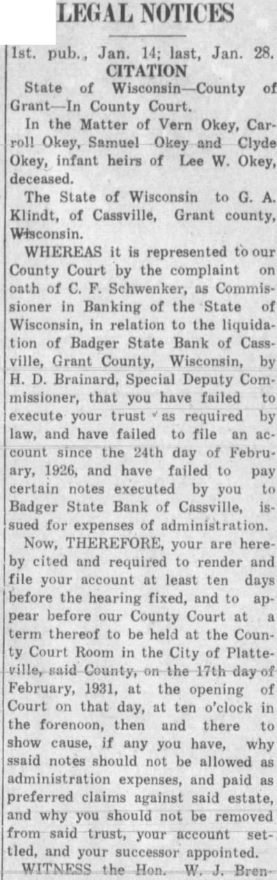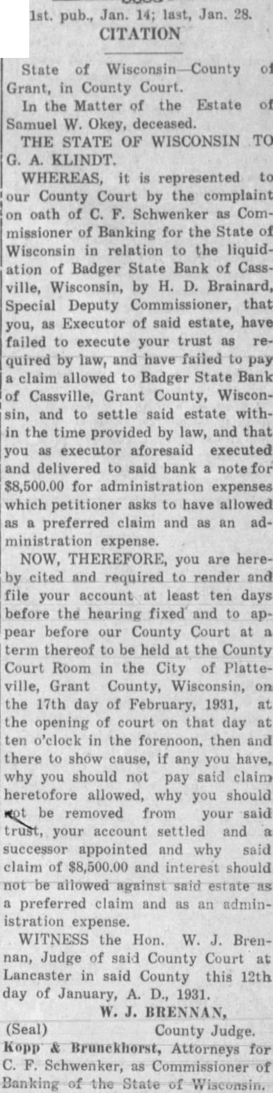 State of Wisconsin-County of Grant, in County Court. In the Matter of the Estate of Samuel W. Okey, deceased. THE STATE OF WISCONSIN TO G. A. KLINDT. WHEREAS, it is represented to our County Court by the complaint on oath of C. F. Schwenker as Commissioner of Banking for the State of Wisconsin in relation to the liquidation of Badger State Bank of Cassville, Wisconsin, by H. D. Brainard, Special Deputy Commissioner, that you, as Executor of said estate, have failed to execute your trust as required by law, and have failed to pay claim allowed to Badger State Bank of Cassville, Grant County, Wisconsin, and to settle said estate within the time provided by law, and that you as executor aforesaid executed and delivered to said bank a $8,500.00 for administration expenses which petitioner asks to have allowed as a preferred claim and as an administration expense. NOW, THEREFORE, you are hereby cited and required to render and file your account at least ten days before the hearing fixed and to appear before our County Court at a term thereof to be held at the County Court Room in the City of Platteville, Grant County, Wisconsin, on the 17th day of February, 1931, at the opening of court on that day at ten o'clock in the forenoon, then and there to show cause, if any you have, why you should not pay said claim heretofore allowed, why you should be removed from your said trust, your account settled and a successor appointed and why said claim of $8,500.00 and interest should not be allowed against said estate as preferred claim and as an administration expense. WITNESS the Hon. W. J. Brennan, Judge of said County Court at Lancaster in said County this 12th day of January, A. D., 1931. W. J. BRENNAN,