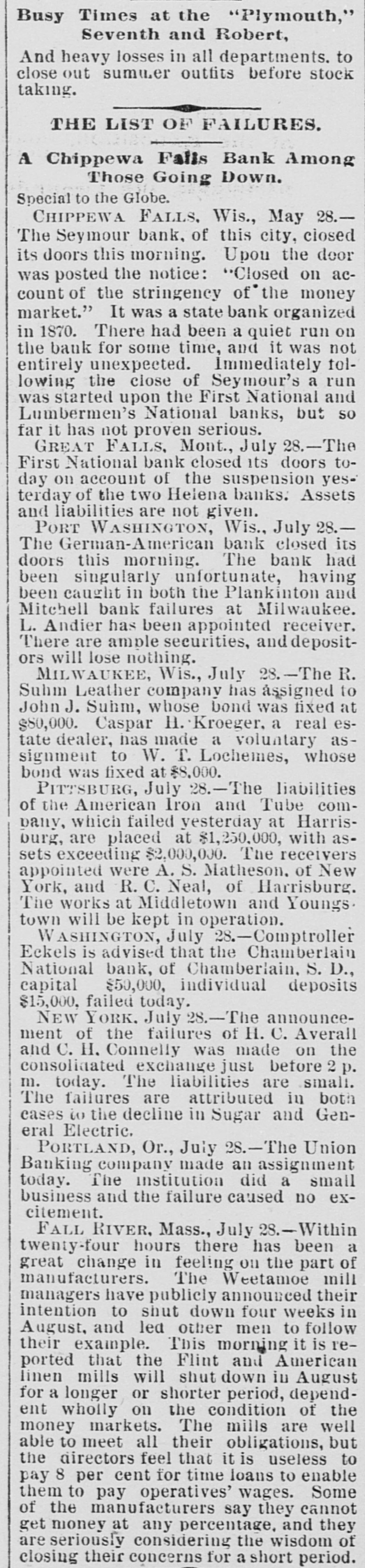 Busy Times at the "Plymouth," Seventh and Robert, And heavy losses in all departments. to close out summer outfits before stock taking. THE LIST OF FAILURES. A Chippewa Falls Bank Among Those Going Down. Special to the Globe. CHIPPEWA FALLS. Wis., May 28.The Seymour bank, of this city, closed its doors this morning. Upou the door was posted the notice: "Closed on account of the stringency of the money market." It was a state bank organized in 1870. There had been a quiet run on the bank for some time, and it was not entirely unexpected. Immediately tollowing the close of Seymour's a run was started upon the First National and Lumbermen's National banks, but so far it has not proven serious. GREAT FALLS, Mont., July 28.-The First National bank closed its doors today on account of the suspension yesterday of the two Helena banks: Assets and liabilities are not given. PORT WASHINGTON, Wis., July 28.The German-American bank closed its doors this morning. The bank had been singularly unfortunate, having been caught in both the Plankinton and Mitchell bank failures at Milwaukee. L. Andier has been appointed receiver. There are ample securities, and depositors will lose nothing. MILWAUKEE, Wis., July 28.-The R. Suhm Leather company has åssigned to John J. Suhm, whose bond was fixed at $80,000. Caspar H. Kroeger, a real estate dealer, has made a voluntary assignment to W. T. Lochemes, whose bond was fixed at $8,000. PITTSBURG, July 28.-The liabilities of the American Iron and Tube company, which failed yesterday at Harrisburg, are placed at $1,250,000, with assets exceeding $2,000,000. The receivers appointed were A. S. Matheson. of New York, and R. C. Neal, of Harrisburg. The works at Middletown and Youngs, town will be kept in operation. WASHINGTON, July 28.-Comptroller Eckels is advised that the Chamberlain National bank, of Chamberlain, S. D., capital $50,000, individual deposits $15,000, failed today. NEW YORK. July 28.-The announcement of the failures of H. C. Averall and C. H. Connelly was made on the consolidated exchange just before 2 p. m. today. The liabilities are small. The failures are attributed in both cases to the decline in Sugar and General Electric. PORTLAND, Or., July 28.-The Union Banking company made an assignment today. The institution did a small business and the failure caused no excitement. FALL RIVER, Mass., July 28.-Within twenty-four hours there has been a great change in feeling on the part of manufacturers. The Weetamoe mill managers have publicly announced their intention to shut down four weeks in August, and led other men to follow their example. This morning it is reported that the Flint and American linen mills will shut down in August for a longer or shorter period, dependent wholly on the condition of the money markets. The mills are well able to meet all their obligations, but the directors feel that it is useless to pay 8 per cent for time loans to enable them to pay operatives' wages. Some of the manufacturers say they cannot get money at any percentage, and they
