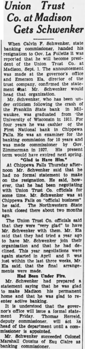 Union Trust Co. at Madison Gets Schwenker When Calvin Schwenker, state banking handed his resignation Gov. Follette was reported that will become president the Union Trust at Madison, Sept. The announcement was made the governor's office and Emerson director of the trust company. confirmed the statement that Mr Schwenker would head that Mr. Schwenker who has been under criticism the crash of Franklin State bank Milwaukee, graduated from the University Wisconsin in 1911. For four years he the First National bank in Chippewa Falls. He examiner for the banking commission 10 years and made commissioner Gov Zimmerman in 1927. His present term would have expired next spring. "Glad Have Him." At Chippewa Falls Thursday afternoon Mr. Schwenker that had no formal make on the resignation. He however, that had negotiating with Union Trust Co. officials for some time. Schwenker was Chippewa "official business" said. Northwestern State bank closed there about two months ago. The Union Trust Co. officials said that they glad" to have Mr. with them. Mr. Ela said that they had tried year ago to have Mr. join their and that he had declined. This were again started April and was just within the last three Ela said. that the final arrangements were made Had Been Under Fire. Mr. Schwenker prepared statement saying that he make Madison his permanent home that he was glad to reenter active banking. understood that the governor's office will issue formal statement Friday. Thomas Herreid. deputy commissioner. act head of the department until comappointed. Mr. Schwenker Colonel Marshall Cousins of Eau Claire as banking commissioner.
