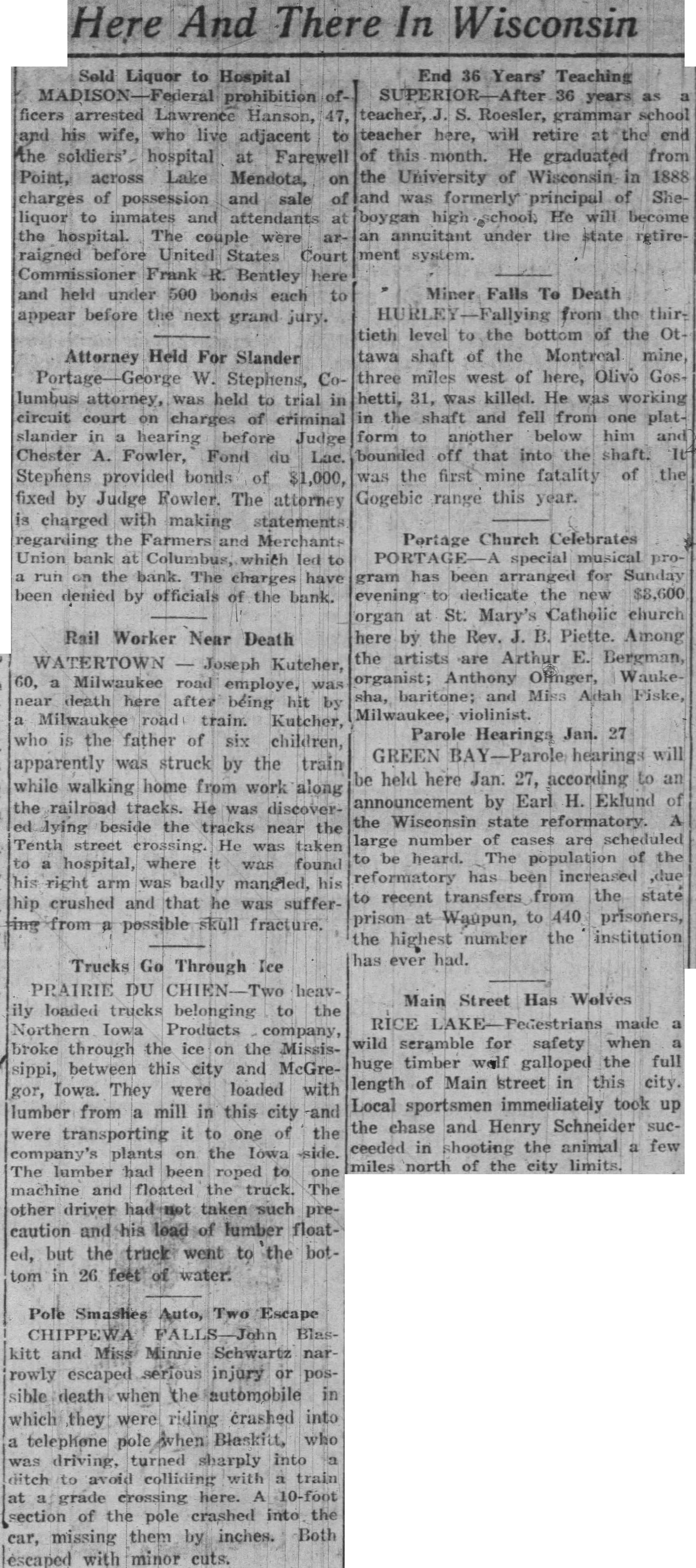 Portage Church Celebrates PORTAGE- special musical program has been arranged for Sunday evening to dedicate the new $8,600 organ at St. Mary's Catholic ehurch here by the Rev. J. B. Piette. Among the artists are Arthur E. Bergman, organist; Anthony Olinger, Waukesha, baritone; and Miss Adah Fiske, Milwaukee, violinist. Parole Hearings Jan. 27 GREEN hearings will be held here Jan: 27, according to an announcement by Earl H. Eklund of the Wisconsin state reformatory. A large number of cases are scheduled to be heard. The population of the reformatory has been increased ,due to recent transfers from the state prison at Waupun, to 440 prisoners, the highest number the institution has ever had.