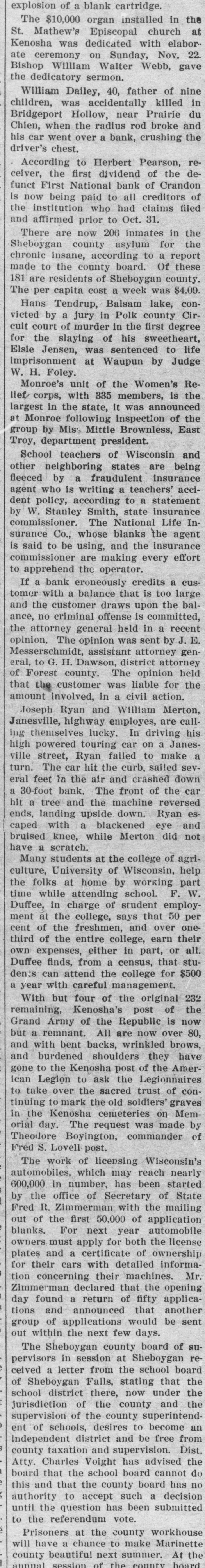 plosion of a blank cartridge. The $10,000 organ installed in Mathew's Episcopal church nosha was dedicated with elabor e ceremony on Sunday, Nov. shop William Walter Webb, ) dedicatory sermon. William Dailey, 40, father of Idren, was accidentally killed idgeport Hollow, near Prairie ien, when the radius rod broke car went over a bank, crushing ver's chest. According to Herbert Pearson, ver, the first dividend of the ct First National bank of Crando now being paid to all creditors e institution who had claims d affirmed prior to Oct. 31. There are now 206 inmates in eboygan county asylum for onic insane, according to a de to the county board. Of thes are residents of Sheboygan county e per capita cost a week was $4.09 Hans Tendrup, Balsam lake, ted by a jury in Polk county t court of murder in the first degre the slaying of his sweetheart sie Jensen, was sentenced to prisonment at Waupun by Judg Foley. H Monroe's unit of the Women's e corps, with 335 members, is gest in the state, it was announce Monroe following inspection of up by Miss Mittle Brownless, oy, department president. School teachers of Wisconsin ier neighboring states are eced by a fraudulent insuranc ent who is writing a teachers' acci at policy, according to a statemen W. Stanley Smith, state Insuranc nmissioner. The National Life ance Co., whose blanks the said to be using, and the insuranc nmissioner are making every apprehend the operator. f a bank eroneously credits a ner with a balance that is too larg 1 the customer draws upon the ce, no criminal offense is committed , attorney general held in a nion. The opinion was sent by J. sserschmidt, assistant attorney 1, to G. H. Dawson, district attorne Forest county. The opinion it the customer was liable for ount involved, in a civil action. Joseph Ryan and William Mertor nesville, highway employes, are : themselves lucky. In driving th powered touring car on a Janes le street, Ryan failed to make n. The car hit the curb, sailed 11 feet in the air and crashed dow 30-foot bank. The front of the a tree and the machine reverse is, landing upside down. Ryan ed with a blackened eye ised knee, while Merton did ve a scratch. Many students at the college of ture, University of Wisconsin, : folks at home by working e while attending school. F. ffee, in charge of student employ nt at the college, says that 50 it of the freshmen, and over rd of the entire college, earn thei n expenses, either in part, or ffee finds, from a census, that nts can attend the college for ear with careful management. With but four of the original naining, Kenosha's post of and Army of the Republic is t a remnant. All are now over d with bent backs, wrinkled brows d burdened shoulders they ne to the Kenosha post of the Ame in Legion to ask the Legionnaire take over the sacred trust of uing to mark the old soldiers' the Kenosha cemeteries on al day. The request was made eodore Boyington, commander ed U. Lovell