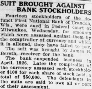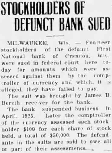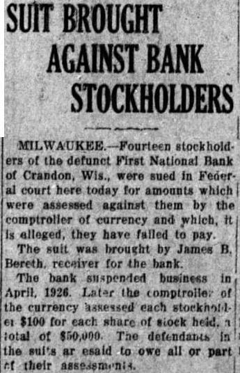 SUIT BROUGHT AGAINST BANK STOCKHOLDERS Fourteen stockholders of the funct First National Bank of Crandon, were sued in Federal court Milwaukee, for which were assessed against them by the comptroller of currency it is alleged, they have failed to The suit was brought by James Bereth, receiver for the bank The bank suspended business in April, 1926. Later the comptroller the currency assessed each stockhold. er $100 for share of stock total of $50,000. The defendants in the suits are said to owe all or part of their assessment.