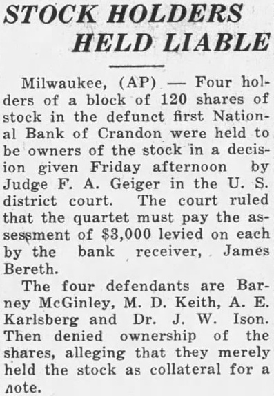 STOCK HOLDERS HELD LIABLE Milwaukee, (AP) Four holders of block of 120 shares of stock in the defunct first National Bank of Crandon were held to be owners of the stock in decision given Friday afternoon by Judge F. Geiger in the district court. The court ruled that the quartet must pay the sessment of $3,000 levied on each by the bank receiver, James Bereth. The four defendants are Barney McGinley, M. Keith, Karlsberg and Dr. Ison. Then denied ownership of the shares, alleging that they merely held the stock as collateral for note.
