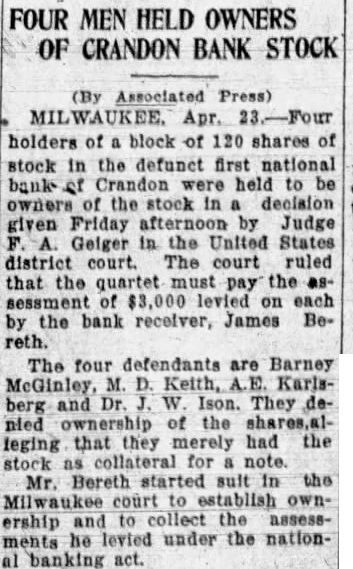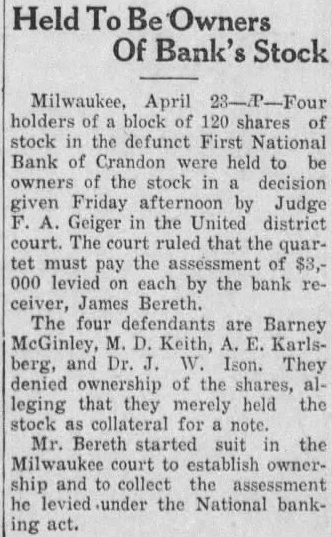 Held Owners Of Bank's Stock Milwaukee, April holders block of shares stock in the defunct First National Bank of Crandon held to stock in decision given Friday afternoon Judge Geiger in the United district court. ruled that the must pay the $3,levied each by the bank ceiver, James Bereth. The defendants are Barney McGinley, Keith, Karlsberg, Ison. They denied ownership of the shares, leging that they merely held the stock Mr. Bereth started suit in the Milwaukee ownerand to collect the he under the National bankact.
