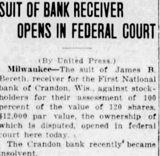 SUIT OF BANK RECEIVER OPENS IN FEDERAL COURT United Press.) suit of James B Bereth. receiver for the First National bank of Crandon, Wis. against stockholders for their 100 percent of the value of 120 shares. par the which disputed. opened in federal The Crandon bank recently* became
