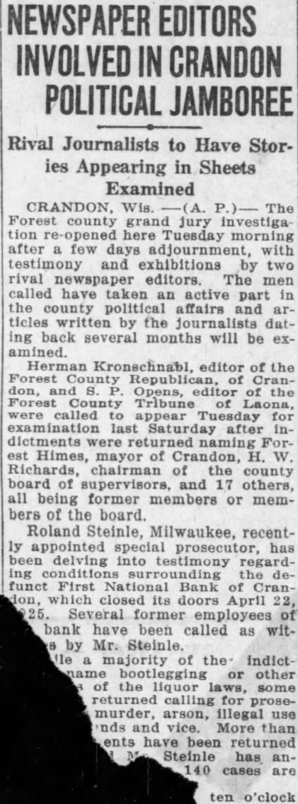 NEWSPAPER EDITORS INVOLVED IN CRANDON POLITICAL JAMBOREE Rival Journalists to Have Stories Appearing in Sheets Examined CRANDON, Wis. The Forest county grand jury tion re-opened Tuesday morning after few days adjournment, with testimony and exhibitions by two rival newspaper editors. The men called have taken an active part in county political affairs arwritten by the journalists dating back several months will be examined. Herman Kronschnabl, editor of the Forest Crandon, and Opens, of the Forest County Tribune of were called appear for examination last Saturday after indictments returned est Himes, mayor of Crandon, H. W Richards, chairman of the county board of supervisors, and 17 others, all being former members or members of the board. Roland Steinle, Milwaukee, recentappointed has delving into testimony ing the defunct First National Bank of Cran don, which closed its doors April 22, Several former employees of bank have been called as witby Mr. Steinle. majority of the indictname bootlegging or other the liquor laws, some returned calling for prosemurder, arson, illegal use nds vice More than ents have been returned Steinle ancases are
