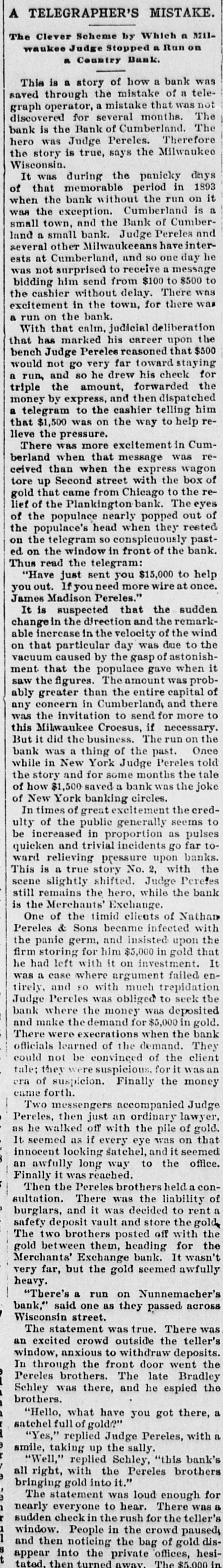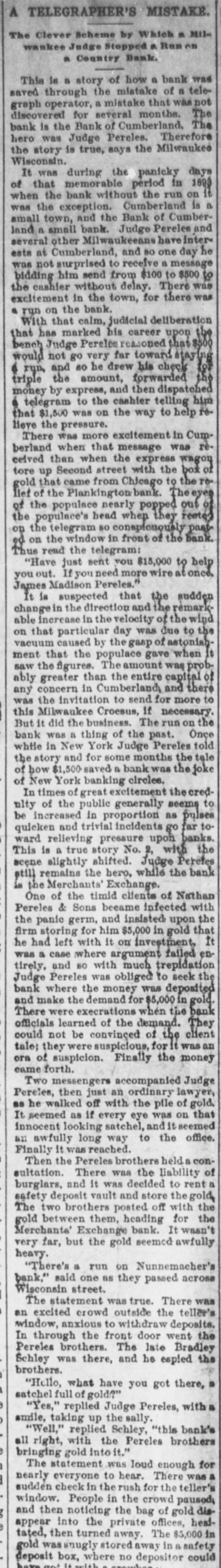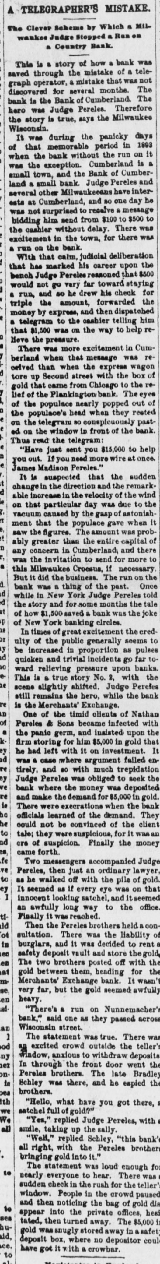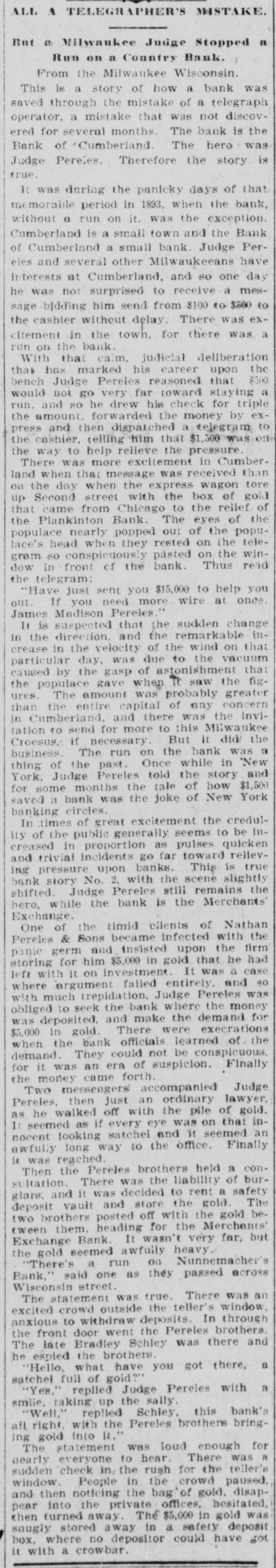 ALL A TELEGRAPHER'S MISTAKE. But so Milwaukee Judge Stopped a Run on a Country Bank. From the Milwaukee Wisconsin. This is a story of how a bank was saved through the mistake of a telegraph operator, a mistake that was not discovered for several months. The bank is the Bank of "Cumberland. The hero was Judge Pereles. Therefore the story is true. It was during the panicky days of that memorable period in 1893, when the bank, without a run on it. was the exception. Cumberland is a small town and the Bank of Cumberland a small bank. Judge Perand several other Milwaukeeans have interests at Cumberland, and so one day was not surprised to receive a message bidding him send from $100 to $500 to the cashier without delay. There was excitement in the town, for there was, a run on the bank. With that calm, judicial deliberation that has marked his career upon the bench Judge Pereles reasoned that $500 would not go very far toward staying a run. and so he drew his check for triple the amount. forwarded the money by express and then dispatched a telegram to the cashier, telling him that $1,500 was one the way to help relieve the pressure. There was more excitement in Cumberand when that message was received than the day when the express wagon tore Second street with the box of gold that came from Chicago to the relief of the Plankinton Bank. The eyes of the populace nearly popped out of the populace's head when they rested on the telegram so conspicuously påsted on the window in front of the bank. Thus read the telegram: "Have just sent you $15,000 to help you out. If you need more wire at once. James Madison Pereles." It is suspected that the sudden change the direction. and the remarkable increase in the velocity of the wind on that particular day, was due to the vacuum caused by the gasp of astonishment that the populace gave when Tt saw the figures. The amount was probably greater than the entire capital of any concern in Cumberland, and there was the invitation to send for more to this Milwaukee Croesus. if necessary. But it did the business. The run on the bank was a thing of the past. Once while in "New York, Judge Pereles told the story and for some months the tale of how $1,500 saved a bank was the joke of New York banking circles. In times of great excitement the credulty of the public generally seems to be increased in proportion as pulses quicken and trivial incidents go far toward relieving pressure upon banks. This is true bank story No. 2, with the scene slightly shifted. Judge Pereles still remains the hero, while the bank is the Merchants Exchange. One of the timid clients of Nathan Pereles & Sons became infected with the panic germ and insisted upon the firm storing for him $5,000 in gold that he had left with it on investment. It was a case where argument failed entirely, and so with much trepidation, Judge Pereles was obliged to seek the bank where the money was deposited. and make the demand for $5,000 in gold. There were execrations when the bank officials learned of the demand. They could not be conspicuous. for it was an era of suspicion. Finally the money came forth. Two messengers accompanied Judge Pereles, then just an ordinary lawyer, he walked off with the pile of gold. It seemed as if every eye was on that innocent looking satchel and it seemed an awfully long way to the office. Finally was reached. Then the Pereles brothers held a consultation. There was the liability of burglars, and it was decided to rent a safety deposit vault and store the gold. The two brothers posted off with the gold between them. heading for the Merchants' Exchange Bank. It wasn't very far, but the gold seemed awfuily heavy. "There's a run on Nunnemacher's Bank," said one as they passed across Wisconsin street. The statement was true. There was an excited crowd outside the teller's window, deposits In through