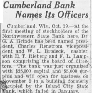 Cumberland Bank Names Its Officers Cumberland, Wis., Oct. 19. At the first meeting of stockholders of the Northwestern State Bank here, Dr. G. A. Grinde has been named president, Charles Renstrom vicepresident and W. Brodeck, cashier, with E. Rieberg and Lampson compr the board of direct tors, The bank was just with $25,000 capital and $5,000 surplus and will open for business on November 2 in building formerly occupied by the Island City State Bank, which failed in January
