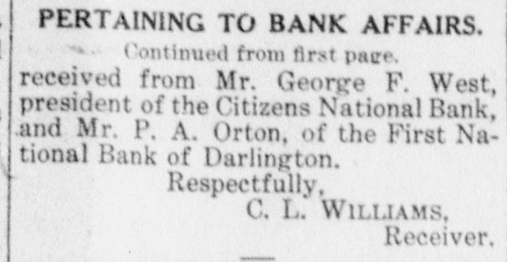PERTAINING TO BANK AFFAIRS. Continued from first page. received from Mr. George F. West, president of the Citizens National Bank, and Mr. P. A. Orton, of the First National Bank of Darlington. Respectfully, C.L. WILLIAMS, Receiver.