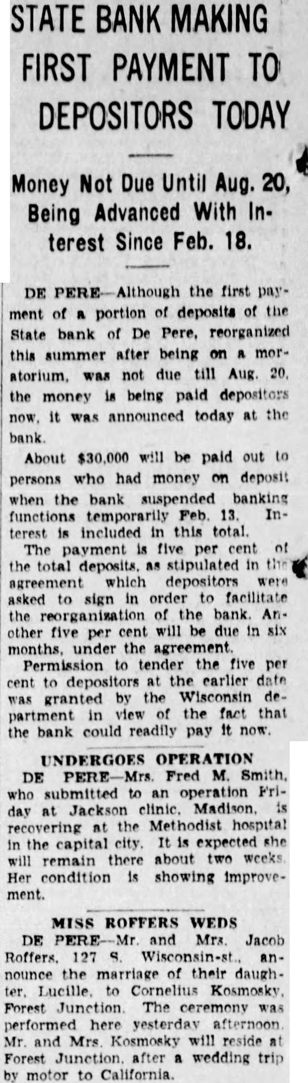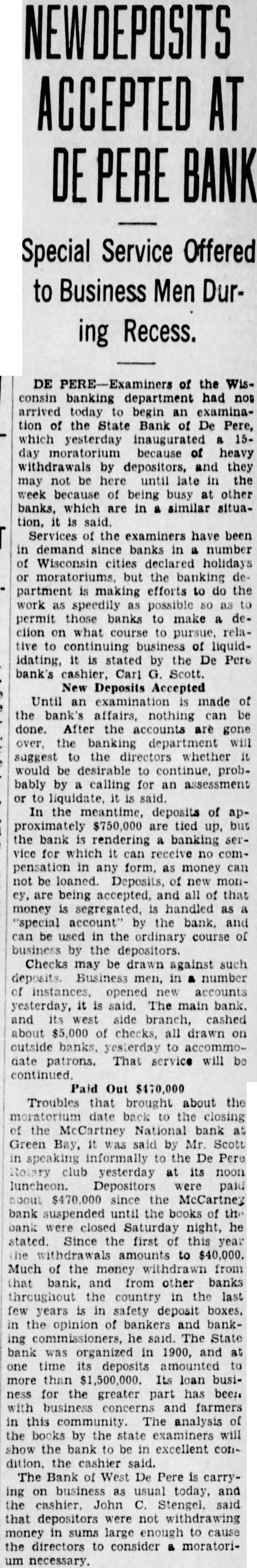 NEWDEPOSITS ACCEPTED AT DE PERE BANK Special Service Offered to Business Men During Recess. DE of the Wisconsin banking had not arrived today begin an examination of the State Bank of De Pere, which inaugurated 15day moratorium because of heavy withdrawals by depositors, and they may not be late in the because of busy other banks, which are in similar situation, is Services of the examiners have been in demand since banks number of Wisconsin cities declared holidays moratoriums. but the banking department is making efforts to do the work as speedily possible so as permit those banks to make declion on what course to pursue, relative continuing business of liquididating, by the De Pert bank's cashier, Carl Scott. New Deposits Accepted Until an examination made of the bank's affairs, nothing can be done. the are gone the will suggest the whether would be desirable to probbably by calling for an assessment or to liquidate, said In the meantime, deposits of proximately $750,000 are tied up, but the bank banking service for which can no compensation form, as money can not be loaned. Deposits of new are being accepted, and all of that money segregated, is handled as "special account by the bank, and can be used in the ordinary course business the depositors Checks may be drawn against such deposits. Business men, in number of instances, accounts yesterday, said. The bank. and its west side branch, cashed about 000 of checks, all drawn on outside banks, to date patrons. That service will be Paid Out $470,000 Troubles that brought about the the the McCartney bank at Green Bay, said by Mr. Scott in speaking to the De Pere Rotary club yesterday at its noon luncheon. Depositors about $470,000 since the McCartney bank suspended until the books of the bank closed Saturday night, he stated. Since first of this year the amounts to $40,000. Much of the money withdrawn from that bank, and from banks throughout the country in the last few years is in safety deposit boxes, in the opinion of bankers and banking he The State bank was organized 1900, and at one time its deposits more $1,500,000. Its loan business for the greater part has been with and farmers in this The of the by the state will show the be in excellent condition, the cashier said. The Bank West Pere is carrying business usual today and the cashier. John Stengel, said that were not withdrawing money sums large enough cause the directors to consider moratorium