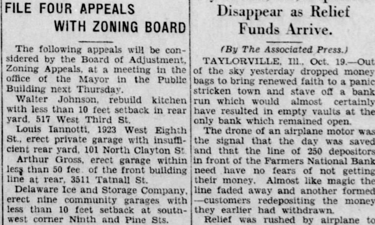 FILE FOUR APPEALS WITH ZONING The following appeals will be con- The Associated sidered by the Adjustment, Zoning meeting the the yesterday dropped money office the Mayor Public bags faith panic Building next Thursday stricken town and stave off bank Walter rebuild kitchen which almost with less than 10 feet setback in rear have resulted empty vaults at the yard. 517 West Third bank which Louis Iannotti, 1923 West Eighth drone of an airplane motor erect private garage insuffi- signal the day was saved cient rear yard, 101 North that the line of 250 depositors Arthur erect within garage in front Farmers Bank than 50 fee the building need have no fears getting rear, 3511 Tatnall their money. Almost like magic the Ice and Company, line faded away and formed erect nine community -customers the money less than feet southcorner Ninth and Pine Sts. Relief rushed airplane