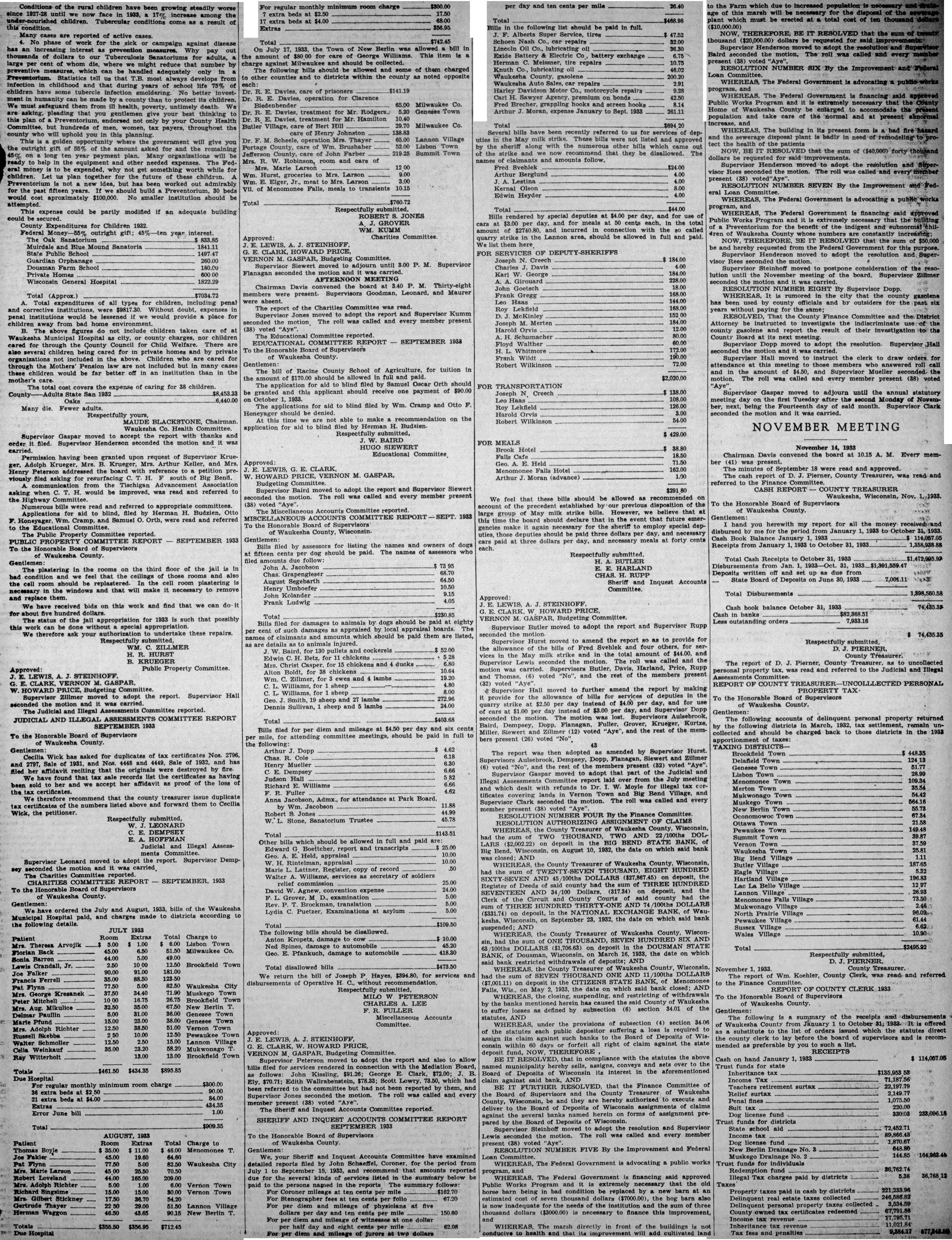Conditions of the rural children have been growing steadily since 1927-28 until now face in 1933, increase among the children. Tubercular conditions come result as of condition. Many cases reported of active No phase of work for the sick or campaign against disease increasing interest prevention Why out pay thousands of dollars our Tuberculosis Sanatoriums for adults, large per cent of whom die, where might reduce that number by measures, which can be handled adequately only in Statistics tell that T.B. most always from infection in childhood and that of school life 75% during years children have some tubercle smoldering. No better investhumanity be made by county than protect its children. safeguard them from health, poverty, untimely death. We asking, pleading that you gentlemen give best thinking to your this plan Preventorium, endorsed not by Health only your County Committee, hundreds of men, women, tax throughout the payers, county who will uphold you in this planning. This golden opportunity where the government will give you outright of 55% of the amount asked for and the remaining long ten year payment plan. Many organizations will be to help in the equipment and other needed expenses. The Fedmoney to be expended, why not get something worth while for children. Let us plan together for the future of these children. not idea, but has been worked out for the past fifteen years. If should build 30 beds would cost aproximately $100,000. No smaller institution should be attempted. This expense could be partly modified if an adequate building could be secured. County Expenditures for Children 1932 Federal outright interest. The Oak Sanatorium Muirdale and Blue Mound Sanatoria 1841.11 State Public School Guardian Orphanage 260.00 Dousman Farm School 180.00 Private Homes 600.00 Wisconsin General Hospital 1822.29 Total (Approx.) $7034.72 Total expenditures of all types for children, including penal and corrective institutions, were $9817.30. Without doubt, expenses penal institutions would lessened would provide place for children away from bad home environment. The above figures not include children taken care of at Waukesha Municipal Hospital city, or county charges, nor children cared for through the County Council for Child Welfare. There are also several being cared for private homes and by private organizations not included in the above. Children are cared for through the Mothers' Pension not included but in many these children would be far better off in an institution than in the mother's care. The total cost the of caring for 38 children. covers expense State San 1932 $8,453.33 Oaks Many die. Fewer adults. Respectfully yours, MAUDE Chairman. Waukesha Co. Health Committee. Supervisor Gaspar moved to accept the report with thanks and order filed. Supervisor Henderson seconded the motion and was earried. Permission having been granted upon request of Supervisor KrueKrueger, Mrs. Krueger, Mrs. Arthur Keller, and Mrs. Adolph Henry Peterson addressed the board with reference to petition filed resurfacing H. south of Big Bend. viously asking for communication from the Tischigan Advancement Association asking when would be improved, was read and referred to the Highway Committee. Numerous bills read and referred to appropriate committees. for aid to blind, filed by Herman H. Budzien, Otto Applications Wm. Samuel Orth, were read and referred to the Educational Committee. The Public Property Committee reported. 1933 PUBLIC PROPERTY the Honorable Board of Supervisors of Waukesha County. Gentlemen: The in the rooms on the third floor of the jail is in condition feel that the ceilings of those rooms and also the cell room should be replastered. In the cell room plastering necessary in the windows and that will make it necessary to remove replace them. We have received bids on this work and find that we can for five hundred dollars. The status of the jail appropriation for 1933 such that possibly this work can be done without special appropriation. therefore ask authorization to undertake these repairs. your Respectfully submitted, WM. ZILLMER HURST B. KRUEGER Public Property Committee. Approved: CLARK, VERNON GASPAR, HOWARD PRICE, Committee. moved adopt the report. Supervisor Hall Supervisor Zillmer the motion and was carried. seconded The Judicial and Illegal Assessments Committee reported. ILLEGAL ASSESSMENTS COMMITTEE REPORT JUDICIAL AND the Honorable Board of Supervisors of Waukesha County. Gentlemen: Cecilia Wick has asked for duplicates of tax certificates Nos. 2796, 4448 and 4449, Sale of and has and 2797, Sale 1931, and Nos. filed her affidavit reciting that originals were destroyed by fire. We have found that tax sale records list the certificates as having her affidavit as proof of the loss of been sold her we accept the certificates. that the county treasurer issue duplicate therefore recommend listed above and forward them to Cecilia certificates the numbers Wick, the petitioner. Respectfully submitted, LEONARD DEMPSEY HOFFMAN Judicial and Illegal Assessments Committee. Leonard moved to adopt the report. Supervisor DempSupervisor seconded the motion and carried The Charities Committee reported. 1933 CHARITIES the Honorable Board Supervisors of Waukesha County. Gentlemen: 1933, bills of the Waukesha have ordered the July and August, and made to districts according to Hospital paid, charges the details. Total $742.45 1933, the Town of New Berlin was allowed bill in On July 17, for care of George Williams. This item is the amount of against and should be collected. charge The following bills should be allowed and some of them charged to other counties and to districts within the county as noted opposite each: Davies, care of prisoners Dr. Davies, operation for Clarence 65.00 Milwaukee Co. Davies, treatment for Mr. 5.20 Genesee Town Dr. Davies, treatment for Mr. Hamilton 10.40 29.70 Milwaukee Co. Butler Village, care Bert Hill care Henry Johnston 138.83 Scheele, operation Mrs. Thayer 