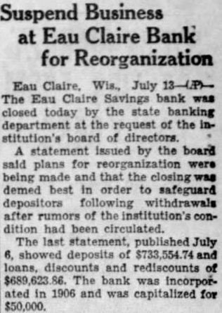 In announcing the decision to close, directors of the State bank said: receipt of word that England had abandoned the gold dard, the Northwest Bancorporation, Minneapolis. terminated gotiations which had been tually closed for acquisition of of the Eau Claire State bank in consideration for the purchaser assuming and paying all sums due from the bank depositors." Avert Chance of Run The announcement further stated that since the closing of the Eau Claire Savings bank, the State bank had forced keep cash by money to meet the of its Officials of the Union Savings declared that directors voted on the closing Sunday night after hearing of the State bank's intention to decided to turn the bank's affairs over to the state banking commissioner rather than take chance on facing run today.