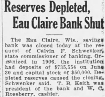 Although two banks at Eau Claire closed today, there nothing in the situation by England's of the gold standard that should have any general effect upon state banks in Wisconsin, Thomas Herreid, acting banking, declared this afternoon. Directors of the Eau Claire State bank. institution, and the Union Savings bank, smaller concern, England's action the indirect cause of their suspension. They brought the total Eau Claire bank closings this year three, the Eau Claire Savings bank having shut its doors on July 13.