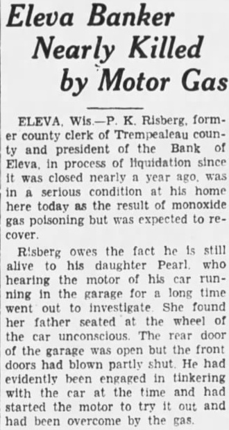 Eleva Banker Nearly Killed by Motor Gas er county clerk of Trempealeau county and president of the Bank of Eleva, in process of liquidation since it was closed nearly year ago was in a serious condition at his home here today as the result of monoxide gas poisoning but was expected to recover Risberg owes the fact he is still alive to his daughter Pearl who hearing the motor of his car running in the garage for long time went out to investigate She found her father seated at the wheel of the car unconsclous. The rear door of the garage was open but the front doors had blown partly shut He had evidently been engaged in tinkering with the car at the time and had started the motor to try it out and had been overcome by the gas.