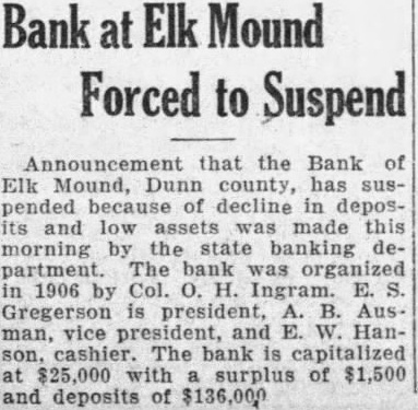 Bank at Elk Mound Forced to Suspend Announcement that the Bank of Elk Mound, Dunn county, has suspended because of decline in deposits and low assets was made this morning by the state banking department. The bank was organized in 1906 by Col. O. H. Ingram. E. S. Gregerson is president, A. B. Ausman, vice president, and E. W. Hanson, cashier. The bank is capitalized at $25,000 with a surplus of $1,500 and deposits of $136,000