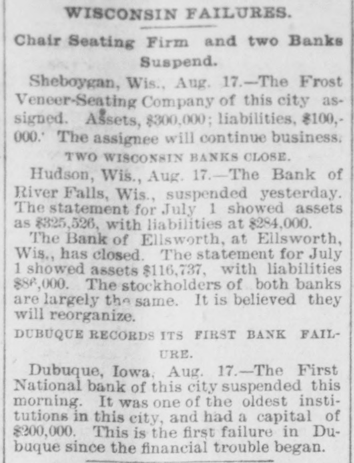 WISCONSIN FAILURES. Chair Seating Firm and two Banks Suspend. Sheboygan, Wis., Aug. 17.-The Frost Veneer-Seating Company of this city assigned. Assets, $300,000; liabilities, $100,000.' The assignee will continue business. TWO WISCONSIN BANKS CLOSE. Hudson, Wis., Aug. 17.-The Bank of River Falls, Wis., suspended yesterday. The statement for July 1 showed assets as $325,526, with liabilities at $284,000. The Bank of Ellsworth, at Ellsworth, Wis., has closed. The statement for July 1 showed assets $116,737, with liabilities $86,000. The stockholders of both banks are largely the same. It is believed they will reorganize. DUBUQUE RECORDS ITS FIRST BANK FAILURE. Dubuque, Iowa, Aug. 17.-The First National bank of this city suspended this morning. It was one of the oldest institutions in this city, and had a capital of $200,000. This is the first failure in Dubuque since the financial trouble began.