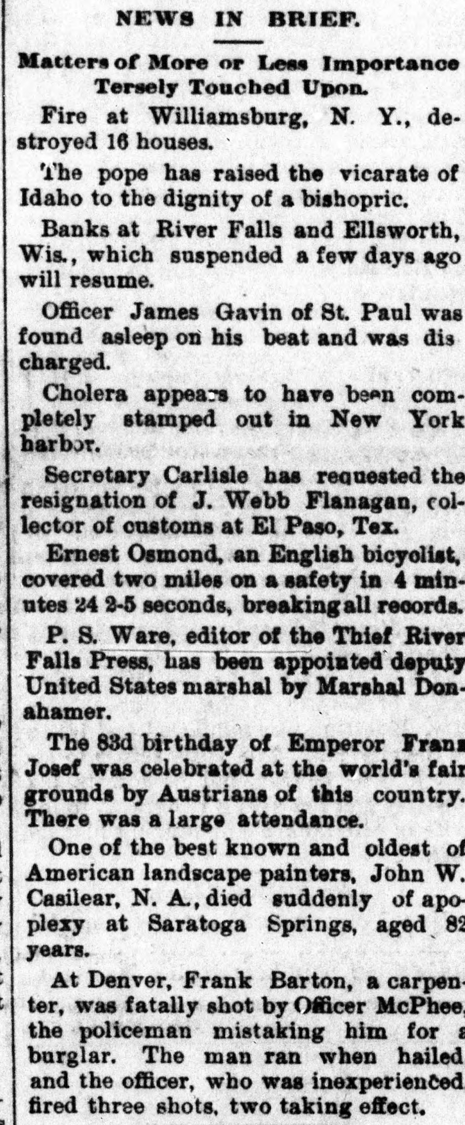 NEWS IN BRIEF. Matters of More or Less Importance Tersely Touched Upon. Fire at Williamsburg, N. Y., destroyed 16 houses. The pope has raised the vicarate of Idaho to the dignity of a bishopric. Banks at River Falls and Ellsworth, Wis., which suspended a few days ago will resume. Officer James Gavin of St. Paul was found asleep on his beat and was dis charged. Cholera appears to have been completely stamped out in New York harbor. Secretary Carlisle has requested the resignation of J. Webb Flanagan, collector of customs at El Paso, Tex. Ernest Osmond, an English bicyolist, covered two miles on a safety in 4 minutes 24 2-5 seconds, breakingall records. P. S. Ware, editor of the Thief River Falls Press, has been appointed deputy United States marshal by Marshal Donahamer. The 83d birthday of Emperor Frans Josef was celebrated at the world's fair grounds by Austrians of this country. There was a large attendance. One of the best known and oldest of American landscape painters, John W. Casilear, N. A., died suddenly of apoplexy at Saratoga Springs, aged 82 years. At Denver, Frank Barton, a carpenter, was fatally shot by Officer McPhee, the policeman mistaking him for a burglar. The man ran when hailed and the officer, who was inexperienced fired three shots, two taking effect.