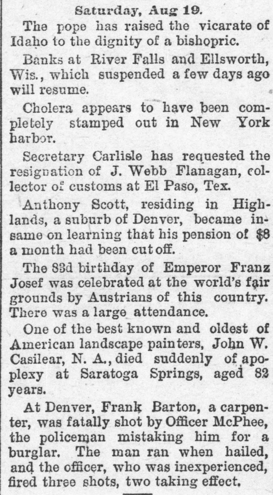 Saturday, Aug 19. The pope has raised the vicarate of Idaho to the dignity of a bishopric. Banks at River Falls and Ellsworth, Wis., which suspended a few days ago will resume. Cholera appears to have been completely stamped out in New York harbor. Secretary Carlisle has requested the resignation of J. Webb Flanagan, collector of customs at El Paso, Tex. Anthony Scott, residing in Highlands, a suburb of Denver, became insame on learning that his pension of $8 a month had been cut off. The 83d birthday of Emperor Franz Josef was celebrated at the world's fair grounds by Austrians of this country. There was a large attendance. One of the best known and oldest of American landscape painters, John W. Casilear, N. A., died suddenly of apoplexy at Saratoga Springs, aged 82 years. At Denver, Frank Barton, a carpenter, was fatally shot by Officer McPhee, the policeman mistaking him for a burglar. The man ran when hailed, and the officer, who was inexperienced, fired three shots, two taking effect.