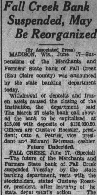 Fall Creek Bank Suspended, May Be Reorganized (By Associated Press) MADISON, Wis., June 17-Suspensions of the Merchants and Farmers' State bank of Fall Creek (Eau Claire county) was announced by the state banking department today. Withdrawal of deposits and frozen assets caused the closing of the institution, the department said The March 27 state bank call showed the bank to be capitalized at $15,000 with deposits of $136,030.50. Officers are Gustave Roessler, president; Otto A. Petrick, vice prestdent and Edward Zetzman, cashier Future Undecided. FALL CREEK, June 17, (Special) -The future of the Merchants and Farmers State bank of Fall Creek suspended Tresday by the state banking department, rests with the stockholders, stated Gustave Roesser, president, after learning of he state depar ment's action The
