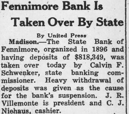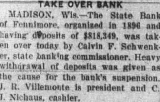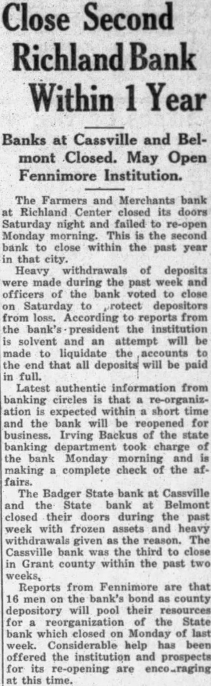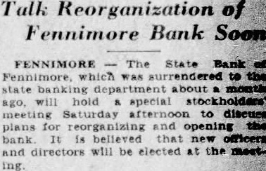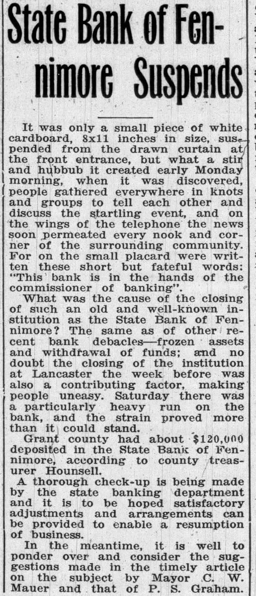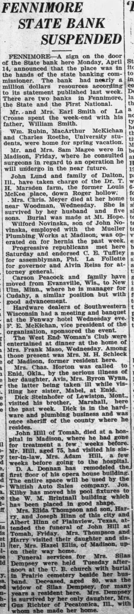 FENNIMORE SUSPENDED sign on the door the State bank here Monday, April that the place in the hands of the state banking commissioner. bank had nearly million dollars according its statement published last week. There are two banks in Fennimore, the State and the First National. Mr. and Mrs. Earl Smith of La Crosse spent with his father, William Smith. Wm. Rubin, MacArthur McKichan and Charles Roethe, students, were home for spring vacation. Mr. and Mrs. Sam Magee were in Friday, where he consulted Madison, in regard to an operation he will undergo in the near future. John Lund and family of Dalton, have the Dr. Marsden farm, former Louis McKee place, down Roger Mrs. Chris. Meyer died at her home near Woodman, Wednesday She is survived by husband and five sons. Burial made at Hope. Wilford Novinska, of John Mueller vinska, employed Plumbing Works at Madison; was for hernia the past week. erated Progressive republicans met here endorsed E. Tuffley Saturday Phi. Follette for for Reiss for governor torney general. Peacock family have Carson moved from Evansville, Wis,, to New where he is manager for Ulm, Minn., similar position but with Cudahy, good advancement. dealers of Southwestern Wisconsin had meeting and banquet the Fenway hotel Wednesday president of the McKichan, vice organization, sponsored event. The West Club were entertained dinner at the home Maso, Among Mrs. Frank M. Schleck those was of former resident here. Mrs. Chas. Horton was called the serious illness Enid, Okla., by Avis, Mrs. Byron Wynn, her daughter, taken ill while visthe latter being sister, Mabel, at iting Steinhofer of Lewiston, Mont., Dick visited Marshall, here Dick is the hardthe past and plumbing business once sheriff of the county where he resides. John Hill of Tomah, died at hosin where he pital few weeks before. treatment had visited his sisHill, Adam few Mrs. before to hospital. weeks going has remodeled his house building. first floor of opera will be used by the The entire Sales company. Jos. Auto his pool fixtures Kilby has building which the placed in good shape. Mrs. Elida son, Har- and Hinn of this city Hinn Texas, of John Hill tended funeral Tomah, Friday. daughter and sisHazel Ellis, of Madison, uptheir home. Mrs. Silas Funeral for held afterchurch with burial noon the B. beside her huswas the band. aged widow of Silas for many here. Mrs. Mrs. by only of III., with Gus whom she made her home.
