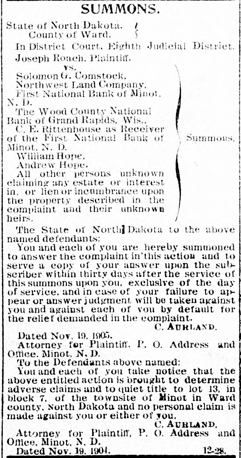 SUMMONS. State of North Dakota. County of Ward. In District Court. Eighth Judicial District. Joseph Roach. Plaintiff. VS. Solomon G. Comstock, Northwest Land Company. First National Bank of Minot. N. D. The Wood County National Bank of Grand Rapids, Wis. C. E. Rittenhouse as Receiver Summons of the First National Bank of Minot. N. D. William Hope. Andrew Hope. All other persons unknown claiming any estate or interest in. or lien or incumbrance upon the property described in the complaint and their unknown heirs. The State of North Dakota to the above named defendants: You and each of you are hereby summoned to answer the complaint in'this action and to serve a copy of your answer upon the subscriber within thirty days after the service of this summons upon you. exclusive of the day of service. and in case of your failure to appear or answer judgment will be taken against you and against each of vou by default for the relief demanded in the complaint. C. AURLAND. Dated Nov. 19. 1905. Attorney for Plaintiff. P. O. Address and Office. Minot. N. D. To the Defendants above named: You and each of you take notice that the above entitled action is brought to determine adverse claims and to quiet title to lot 13, in block 7. of the townsite of Minot in Ward county. North Dakota and no personal claim is made against you or either of you. C. AURLAND. Attorney for Plaintiff, P. O. Address and Office. Minot. N. D. 12-28 Dated Nov. 19. 1904.