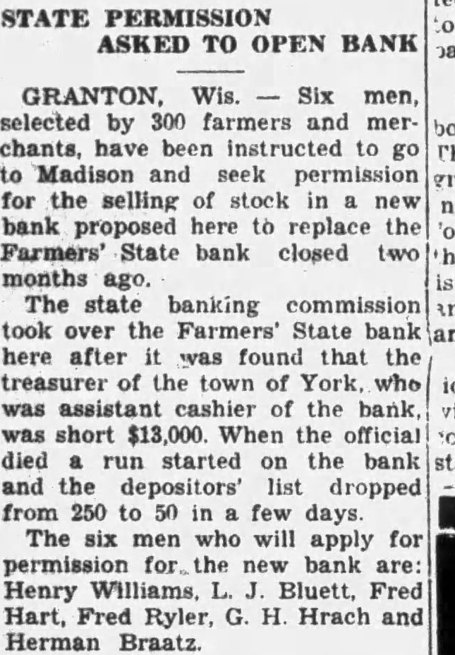 STATE PERMISSION ASKED TO OPEN BANK GRANTON, Wis. Six men, selected by 300 farmers and merchants, have been instructed to go to Madison and seek permission for the selling of stock in a new bank proposed here to replace the Farmers' State bank closed two months ago. The state banking commission took over the Farmers' State bank here after was found that the treasurer of the town of York, who was cashier of the bank, was short $13,000. When the official died a run started on the bank and the depositors' list dropped from 250 to 50 in few days. The six men who will apply for permission for the new bank are: Henry Williams, L. J. Bluett, Fred Hart, Fred Ryler, G. H. Hrach and Herman Braatz.