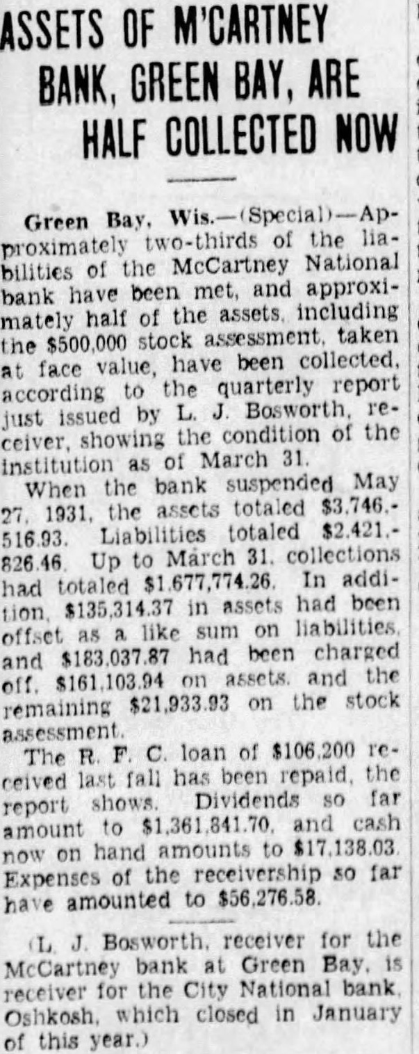 ASSETS OF M'CARTNEY GREEN BAY, ARE BANK, COLLECTED NOW HALF Green Bay. two-thirds of the liaproximately bilities of the McCartney National bank have been met, and approximately half of the assets including the $500,000 stock assessment taken have been collected. at face value, the quarterly report according to rejust issued by the condition of the showing March 31 institution as suspended May When the bank 1931. the assets totaled 27. Liabilities totaled March 31. collections Up to had totaled $1,677,774.26. In addition. $135,314.37 in assets had been offset as like sum on liabilities had been charged and $183,037.87 and the $161,103.94 on off. $21,933.93 on the stock remaining assessment C. loan of The been the last fall has Dividends far report shows. to and cash amount hand amounts to on of the receivership so far Expenses amounted to $56,276.58 L Bosworth receiver for the McCartney bank Green Bay. receiver for the City National bank which closed in January of this year.)