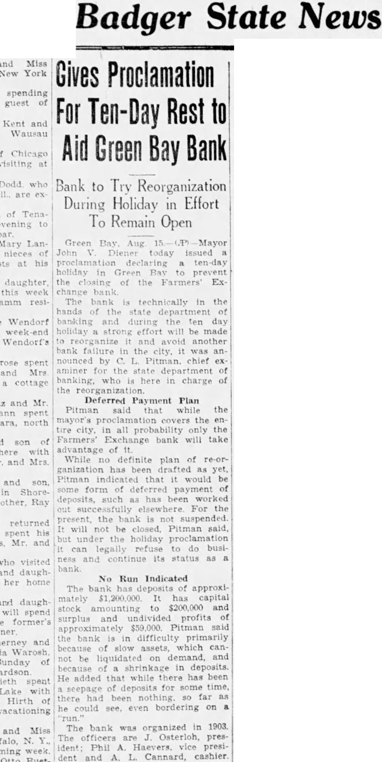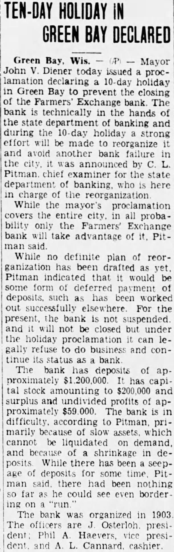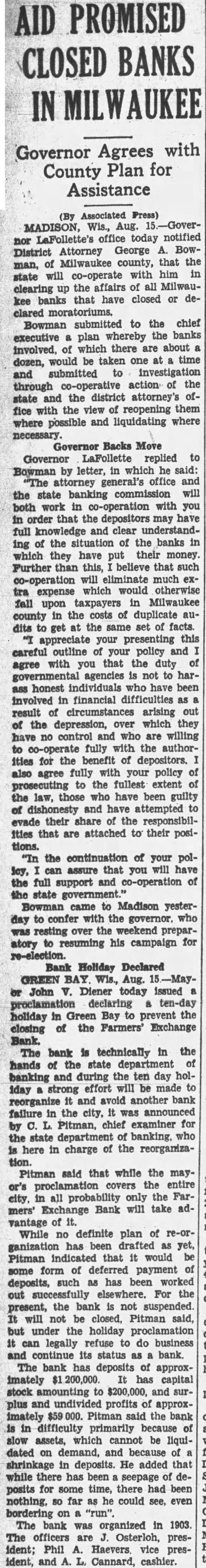 (By Associated Press) MADISON, Wis., Aug. nor LaFollette's office today notified George BowDistrict Attorney of Milwaukee county, that the man, will co-operate with him in state the affairs of all Milwauclearing up kee banks that have closed or clared moratoriums. Bowman submitted to the chief executive plan whereby the banks involved, of which there are about dozen, would be taken one at time and submitted to investigation action of the through co-operative state and the district attorney's office with the view of reopening them where possible and liquidating where necessary. Governor Backs Move Governor LaFollette replied to Bowman by letter, in which he said: attorney general's office and the state banking commission will both work in co-operation with you in order that the depositors may have knowledge and clear understanding of the situation of the banks in which they have put their money. Further than this, believe that such co-operation will eliminate much extra expense which would otherwise taxpayers in Milwaukee fall upon county in the costs of duplicate auto get at the same set of facts. appreciate your presenting this careful outline of your policy and agree with you that the duty of governmental agencies is not to harass honest individuals who have been involved in financial difficulties result of circumstances arising out the depression, over which they have no control and who are willing to co-operate fully with the authorities for the benefit of depositors. also agree fully with your policy prosecuting to the fullest extent of the law, those who have been guilty dishonesty and have attempted to evade their share of the responsibilities that are attached to their positions. "In the continuation of your polassure that you will have the full support and co-operation of state government." Bowman came to Madison yesterday to confer with the governor. who was resting over the weekend preparatory to resuming his campaign for re-election. Bank Holiday Declared GREEN BAY. Aug. John V. Diener today issued proclamation declaring ten-day holiday in Green Bay to prevent the closing of the Farmers' Exchange Bank. The bank technically in the hands of the state department of banking and during the ten day holeffort will be made to iday strong reorganize and avoid another bank failure in the city, it was announced Pitman, chief examiner for the state department of banking, who here in charge of the tion. Pitman said that while the maycovers the entire city. in all probability only the Farmers' Exchange Bank will take advantage of it. While no definite plan of re-organization has been drafted Pitman indicated that it would some form of deferred payment deposits, such as has been worked out successfully elsewhere. For the present, the bank not suspended. will not be closed, Pitman said, but under the holiday proclamation can legally refuse do business and continue its status as bank. The bank has deposits of approximately It has capital stock amounting to $200,000, and surplus and undivided profits of approximately Pitman said the bank in difficulty primarily because slow assets, which cannot be liquidated on demand, and because of shrinkage in deposits. He added that while there has been seepage deposits for some time, there had been nothing, so far as he could see, even bordering on "run". The bank was organized in 1903 The officers Osterloh, president; Phil Haevers vice president, and Cannard, cashier.
