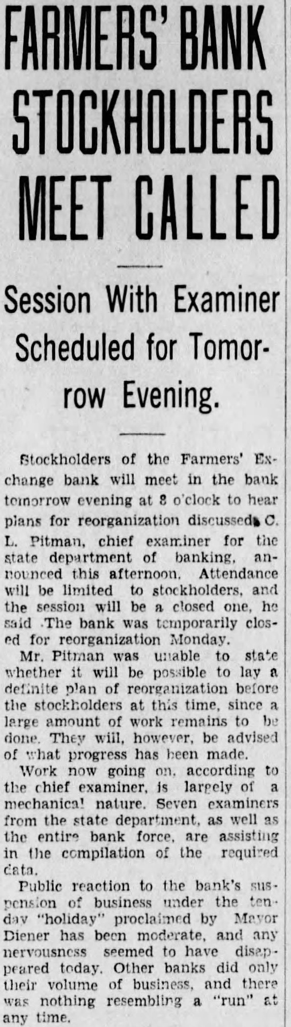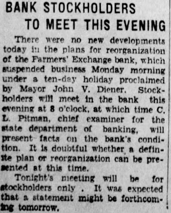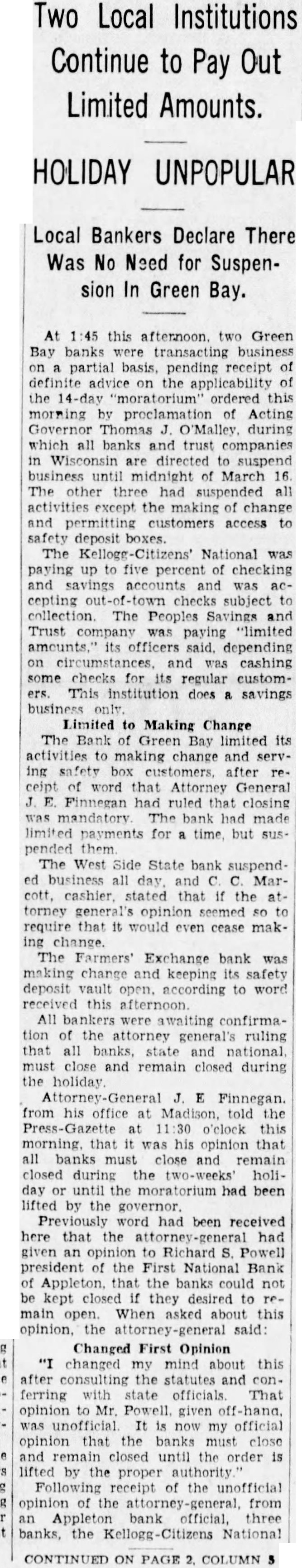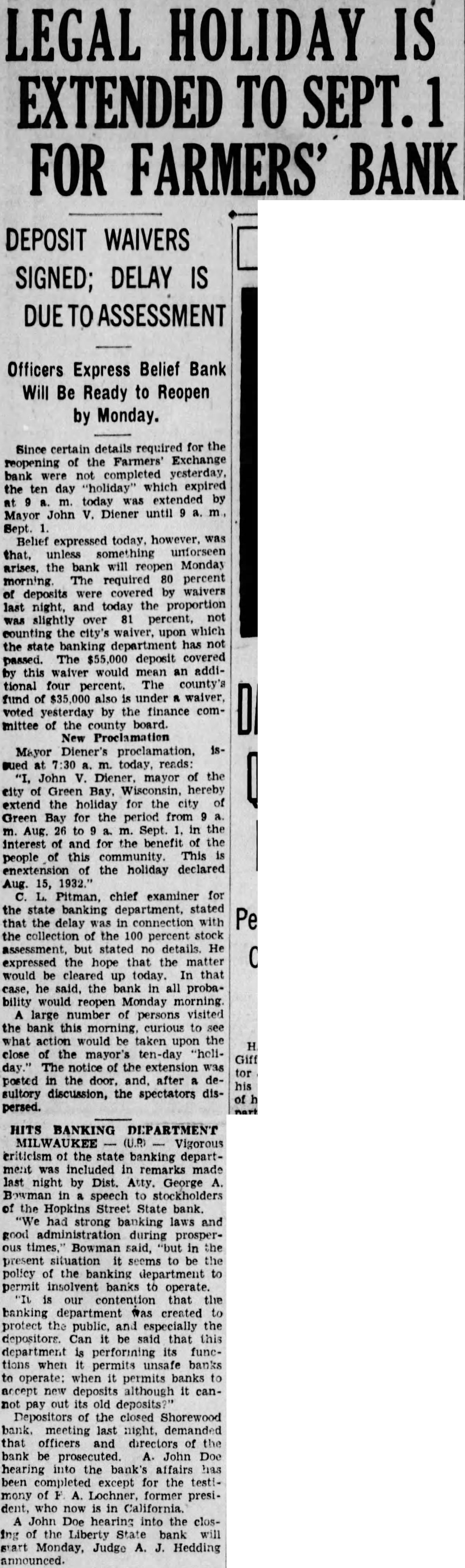(By Associated Press) MADISON, Wis., Aug. nor LaFollette's office today notified George BowDistrict Attorney of Milwaukee county, that the man, will co-operate with him in state the affairs of all Milwauclearing up kee banks that have closed or clared moratoriums. Bowman submitted to the chief executive plan whereby the banks involved, of which there are about dozen, would be taken one at time and submitted to investigation action of the through co-operative state and the district attorney's office with the view of reopening them where possible and liquidating where necessary. Governor Backs Move Governor LaFollette replied to Bowman by letter, in which he said: attorney general's office and the state banking commission will both work in co-operation with you in order that the depositors may have knowledge and clear understanding of the situation of the banks in which they have put their money. Further than this, believe that such co-operation will eliminate much extra expense which would otherwise taxpayers in Milwaukee fall upon county in the costs of duplicate auto get at the same set of facts. appreciate your presenting this careful outline of your policy and agree with you that the duty of governmental agencies is not to harass honest individuals who have been involved in financial difficulties result of circumstances arising out the depression, over which they have no control and who are willing to co-operate fully with the authorities for the benefit of depositors. also agree fully with your policy prosecuting to the fullest extent of the law, those who have been guilty dishonesty and have attempted to evade their share of the responsibilities that are attached to their positions. "In the continuation of your polassure that you will have the full support and co-operation of state government." Bowman came to Madison yesterday to confer with the governor. who was resting over the weekend preparatory to resuming his campaign for re-election. Bank Holiday Declared GREEN BAY. Aug. John V. Diener today issued proclamation declaring ten-day holiday in Green Bay to prevent the closing of the Farmers' Exchange Bank. The bank technically in the hands of the state department of banking and during the ten day holeffort will be made to iday strong reorganize and avoid another bank failure in the city, it was announced Pitman, chief examiner for the state department of banking, who here in charge of the tion. Pitman said that while the maycovers the entire city. in all probability only the Farmers' Exchange Bank will take advantage of it. While no definite plan of re-organization has been drafted Pitman indicated that it would some form of deferred payment deposits, such as has been worked out successfully elsewhere. For the present, the bank not suspended. will not be closed, Pitman said, but under the holiday proclamation can legally refuse do business and continue its status as bank. The bank has deposits of approximately It has capital stock amounting to $200,000, and surplus and undivided profits of approximately Pitman said the bank in difficulty primarily because slow assets, which cannot be liquidated on demand, and because of shrinkage in deposits. He added that while there has been seepage deposits for some time, there had been nothing, so far as he could see, even bordering on "run". The bank was organized in 1903 The officers Osterloh, president; Phil Haevers vice president, and Cannard, cashier.