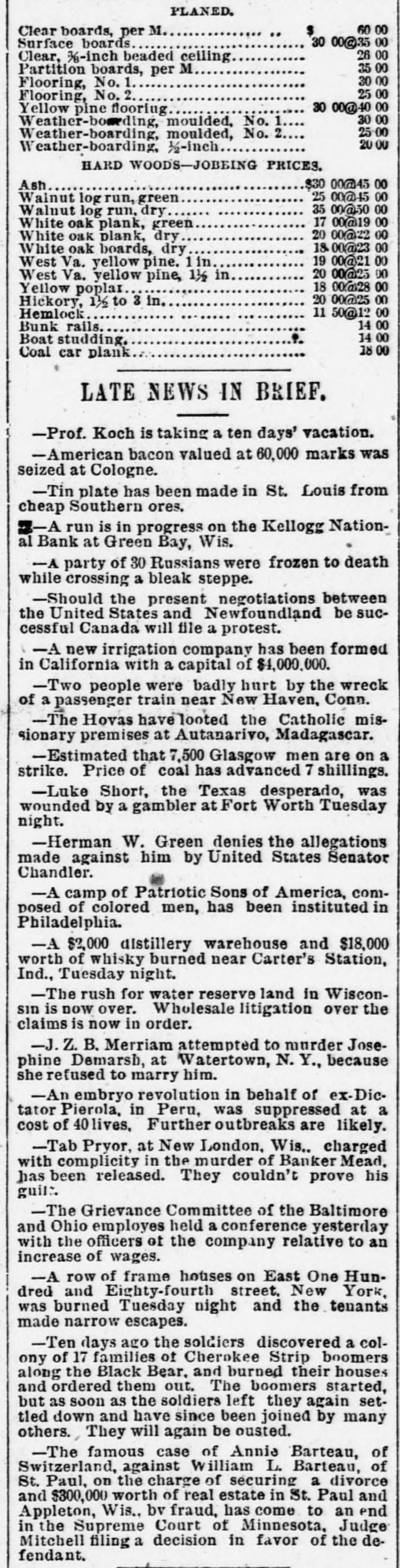 PLANED. 60 00 $ Clear boards, per M Surface boards 30 00@35 00 26 00 Clear, ½-inch beaded ceiling 35 00 Partition boards, per M 30 00 Flooring, No. 1. 25 00 Flooring, No. 2 30 00@40 00 Yellow pine flooring 30 00 Weather-bording, moulded, No. 1 25.00 Weather-boarding, moulded, No. 2 20 00 Weather-boarding, ½-inch HARD WOODS-JOBEING PRICES. $30 00@45 Ash 25 00@45 00 Walnut log run, green 35 00@50 00 Walnut log run, dry 17 00@19 00 White oak plank, green 20 00@22 00 White oak plank, dry 18 00@23 00 White oak boards, dry 19 00@21 00 West Va. yellow pine. 1 in 20 00@25 00 West Va. yellow pine, 1½ in 18 00.0128 00 Yellow poplar 20 00@25 00 Hickory, 1½ to 3 in Hemlock 11 50@12 00 14 00 Bunk rails 14 00 Boat studding. 18 00 Coal car plank LATE NEWS IN BRIEF. -Prof. Koch is taking a ten days' vacation. -American bacon valued at 60,000 marks was seized at Cologne. -Tin plate has been made in St. Louis from cheap Southern ores. -A run is in progress on the Kellogg National Bank at Green Bay, Wis. -A party of 30 Russians were frozen to death while crossing a bleak steppe. -Should the present negotiations between the United States and Newfoundland be successful Canada will file a protest. -A new irrigation company has been formed in California with a capital of $4,000,000. -Two people were badly hurt by the wreck of a passenger train near New Haven, Conn. -The Hovas have looted the Catholic missionary premises at Autanarivo, Madagascar. -Estimated that 7,500 Glasgow men are on a strike. Price of coal has advanced 7 shillings. -Luke Short, the Texas desperado, was wounded by a gambler at Fort Worth Tuesday night. -Herman W. Green denies the allegations made against him by United States Senator Chandler. -A camp of Patriotic Sons of America, composed of colored men, has been instituted in Philadelphia. -A $2,000 distillery warehouse and $18,000 worth of whisky burned near Carter's Station, Ind., Tuesday night. -The rush for water reserve land in Wisconsin is now over. Wholesale litigation over the claims is now in order. -J. Z. B. Merriam attempted to murder Josephine Demarsh, at Watertown, N. Y., because she refused to marry him. -An embryo revolution in behalf of ex-Dictator Pierola, in Peru, was suppressed at a cost of 40 lives, Further outbreaks are likely. -Tab Pryor, at New London, Wis.. charged with complicity in the murder of Banker Mead, has been released. They couldn't prove his guilt. -The Grievance Committee of the Baltimore and Ohio employes held a conference yesterday with the officers of the company relative to an increase of wages. -A row of frame houses on East One Hundred and Eighty-fourth street. New York, was burned Tuesday night and the tenants made narrow escapes. -Ten days ago the soldiers discovered a colony of 17 families of Cherokee Strip boomers along the Black Bear. and burned their houses and ordered them out. The boomers started, but as soon as the soldiers left they again settled down and have since been joined by many others. They will again be ousted. -The famous case of Annie Barteau, of Switzerland, against William L. Barteau, of St. Paul, on the charge of securing a divorce and $300,000 worth of real estate in St. Paul and Appleton, Wis., bv fraud, has come to an end in the Supreme Court of Minnesota, Judge Mitchell filing a decision in favor of the defendant.