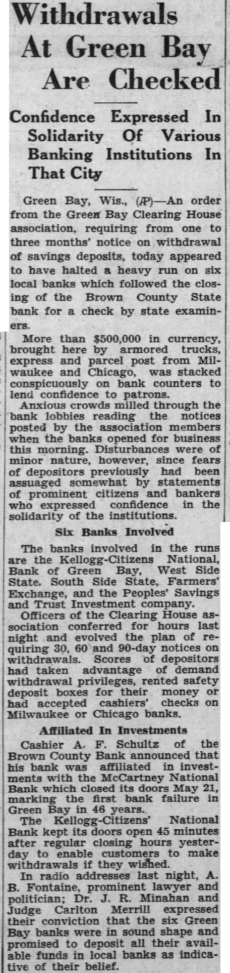 Withdrawals Green Bay Are Checked Confidence Expressed In Solidarity Of Various Banking Institutions In That City Green Bay, Wis., order from the Green Bay Clearing House association, requiring from one to three months' notice on withdrawal of savings deposits, today appeared to have halted heavy run on six local banks which followed the closing of the Brown County State bank for check by state examiners. More than in currency, brought here armored trucks, express and parcel post from Milwaukee Chicago, was stacked conspicuously on bank counters to lend confidence to patrons. Anxious crowds milled through the bank reading the notices posted by the members when the banks opened for business this morning. Disturbances were minor nature, however, since fears of depositors previously had been assuaged by statements of prominent citizens and bankers expressed confidence in the solidarity of the institutions. Six Banks Involved The banks involved in the runs the National, Bank Green Bay, West Side State, South Side State, Farmers' Exchange, and the Peoples' Savings and Trust Officers of the House sociation for hours last night evolved the plan quiring 30, 90-day notices Scores depositors had taken advantage of demand privileges, safety deposit boxes for their money had cashiers' checks on Milwaukee Chicago banks. Affiliated In Investments Cashier Schultz the Brown County Bank that his bank affiliated in investments with the McCartney National Bank which closed its doors May 21, marking the first bank failure Green in years. The National Bank kept its doors open 45 minutes after regular closing hours yesterday to enable customers to make withdrawals they wished. In radio addresses last night, Fontaine, prominent lawyer and politician; R. Minahan Judge Carlton Merrill expressed their conviction that six Green Bay banks were sound shape and to deposit all their availpromised able funds local banks as indicative of their belief.