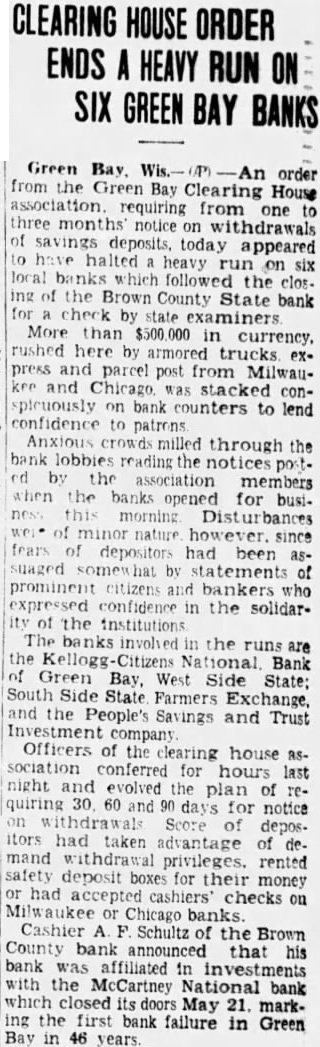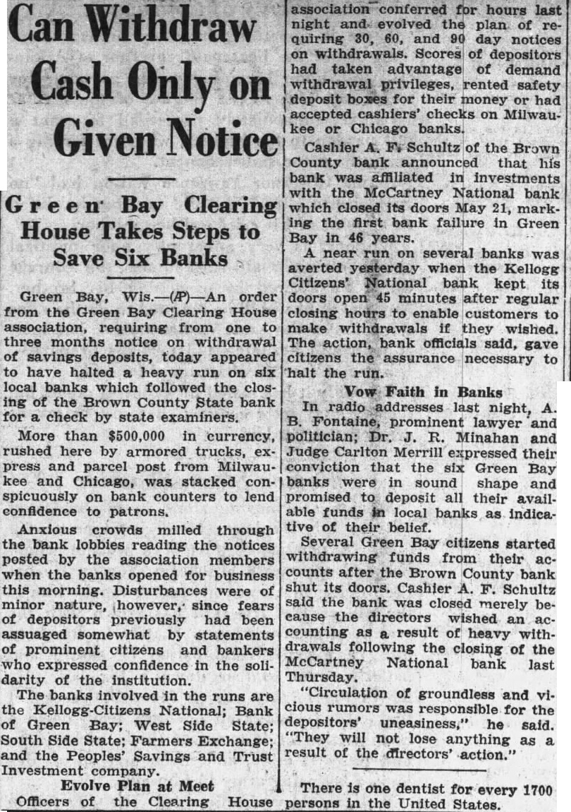 Can Withdraw Cash Only on Given Notice Green Bay Clearing House Takes Steps to Save Six Banks Green Bay, Wis.-(P)-An order from the Green Bay Clearing House association, requiring from one to three months notice on withdrawal of savings deposits, today appeared to have halted a heavy run on six local banks which followed the closing of the Brown County State bank for a check by state examiners. More than $500,000 in currency, rushed here by armored trucks, express and parcel post from Milwaukee and Chicago, was stacked conspicuously on bank counters to lend confidence to patrons. Anxious crowds milled through the bank lobbies reading the notices posted by the association members when the banks opened for business this morning. Disturbances were of minor nature, however, since fears of depositors previously had been assuaged somewhat by statements of prominent citizens and bankers who expressed confidence in the solidarity of the institution. The banks involved in the runs are the Kellogg Citizens National; Bank of Green Bay; West Side State; South Side State; Farmers Exchange; and the Peoples' Savings and Trust Investment company. Evolve Plan at Meet association conferred for hours last night and evolved the plan of requiring 30, 60, and 90 day notices on withdrawals. Scores of depositors had taken advantage of demand withdrawal privileges, rented safety deposit boxes for their money or had accepted cashiers' checks on Milwaukee or Chicago banks. Cashier A. FV Schultz of the Brown County bank announced that his bank was affiliated in investments with the McCartney National bank which closed its doors May 21, marking the first bank failure in Green Bay in 46 years. A near run on several banks was averted yesterday when the Kellogg Citizens' National bank kept its doors open 45 minutes after regular closing hours to enable to make withdrawals if they wished. The action, bank officials said, gave citizens the assurance necessary to halt the run. Vow Faith in Banks In radio addresses last night, A. B. Fontaine, prominent lawyer and politician; Dr. J. R. Minahan and Judge Carlton Merrill expressed their conviction that the six Green Bay banks were in sound shape and promised to deposit all their available funds in local banks as indicative of their belief. Several Green Bay citizens started withdrawing funds from their accounts after the Brown County bank shut its doors. Cashier A. F. Schultz said the bank was closed merely because the directors wished an accounting as result of heavy withdrawals following the closing of the McCartney National bank last Thursday. "Circulation of groundless and vicious rumors was responsible for the depositors' uneasiness," he said. "They will not lose anything as a result of the directors' action." There is one dentist for every 1700