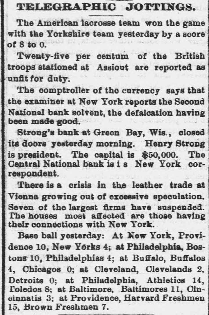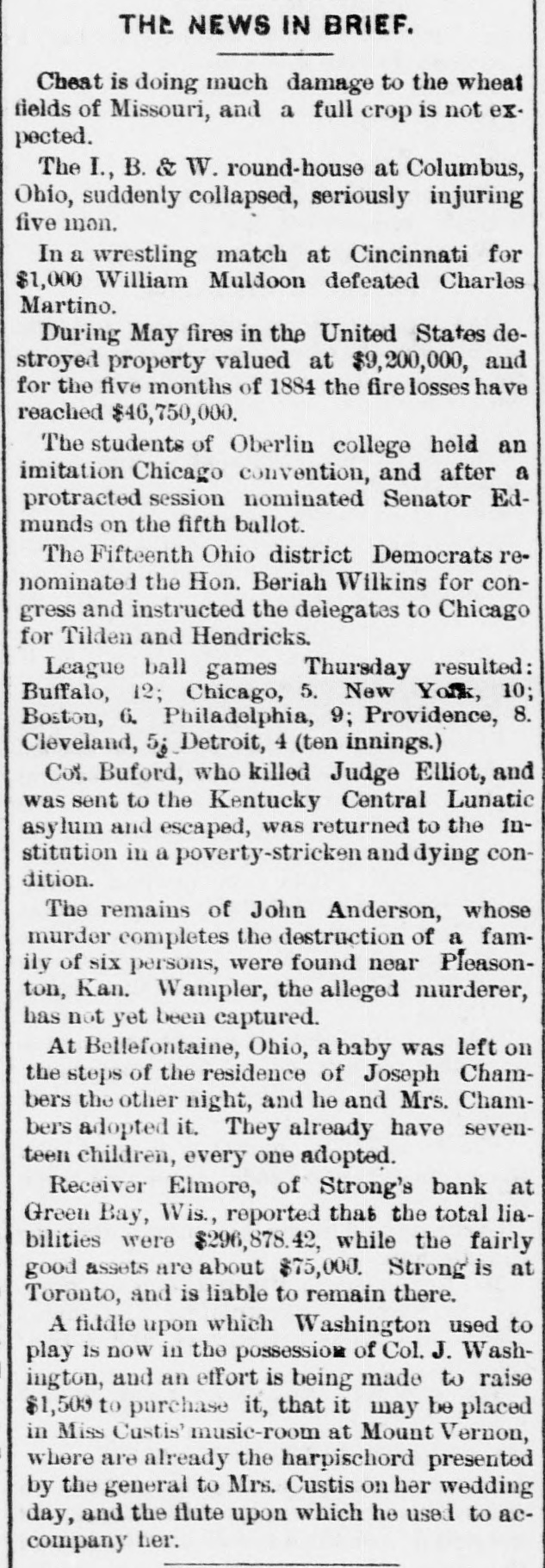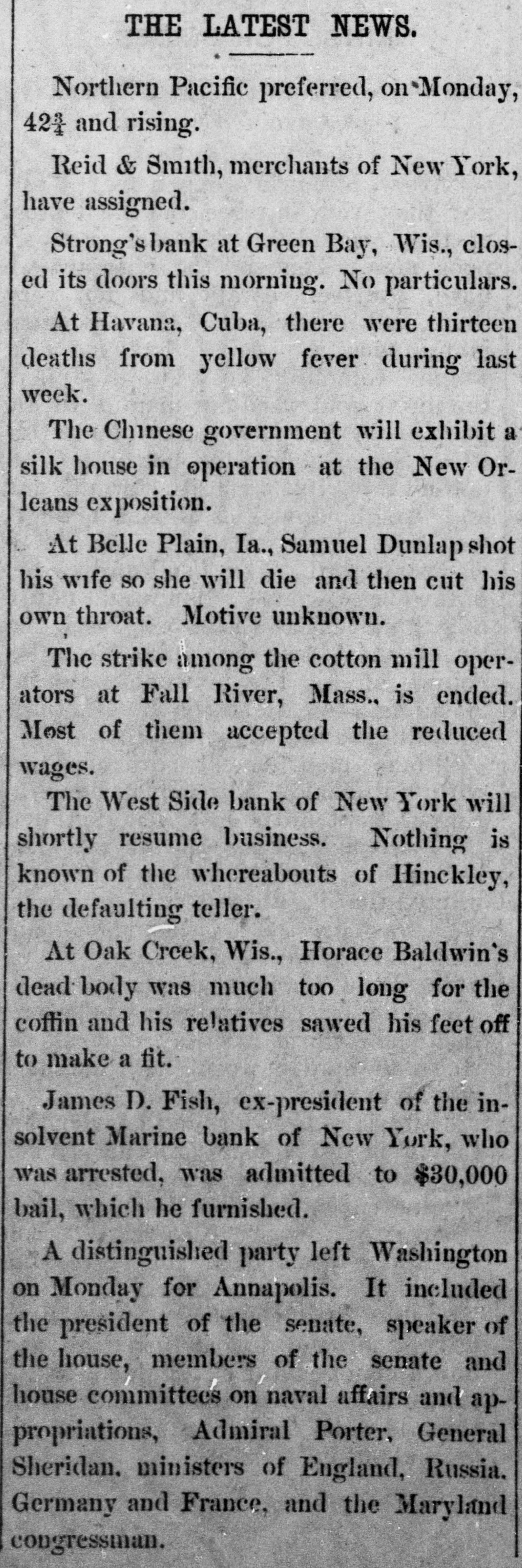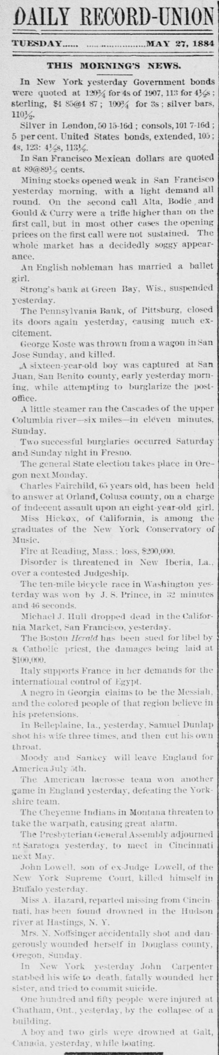 DAILY RECORD-UNION TUESDAY MAY 27, 1884 THIS MORNING'S NEWS. In New York yesterday Government bonds were quoted at 1203/4 for 4s of 1907, 113 for 41/28 sterling, $1 85@4 87 1003/4 for 3s; silver bars, 110½ Silver in London, 50 15-16d consols, 101 7-16d 5 per cent. United States bonds, extended, 105; 4s, 123: 41/28, 113½ In San Francisco Mexican dollars are quoted at 89@89½ cents. Mining stocks opened weak in San Francisco yesterday morning, with a light demand all round. On the second call Alta, Bodie and Gould & Curry were a trifle higher than on the first call, but in most other cases the opening prices on the first call were not sustained. The whole market has a decidedly soggy appearance. An English nobleman has married a ballet girl. Strong's bank at Green Bay, Wis., suspended yesterday. The Pennsylvania Bank, of Pittsburg, closed its doors again yesterday, causing much excitement. George Koste was thrown from a wagon in San Jose Sunday, and killed. A sixteen-year-old boy was captured at San Juan, San Benito county, early yesterday morning, while attempting to burglarize the postoffice. A little steamer ran the Cascades of the upper Columbia river-six miles-in eléven minutes, Sunday. Two successful burglaries occurred Saturday and Sunday night in Fresno. The general State election takes place in Oregon next Monday. Charles Fairchild, 65 years old, has been held to answer at Orland, Colusa county, on a charge of indecent assault upon an eight-year-old girl. Miss Hickox, of California, is among the graduates of the New York Conservatory of Music. Fire at Reading, Mass.: loss, $200,000. Disorder is threatened in New Iberia, La., over a contested Judgeship. The ten-mile bicycle race in Washington yesterday was won by J. S. Prince, in 32 minutes and 46 seconds. Michael J. Hull dropped dead in the California Market, San Francisco, yesterday. The Boston Herald has been sued for libel by a Catholic priest, the damages being laid at $100,000. Italy supports France in her demands for the international control of Egypt. A negro in Georgia claims to be the Messiah, and the colored people of that region believe in his pretensions. In Belleplaine, la., yesterday, Samuel Dunlap shot his wife three times, and then cut his own throat. Moody and Sankey will leave England for America July 5th. The American lacrosse team won another game in England yesterday, defeating the Yorkshire team. The Cheyenne Indians in Montana threaten to take the warpath, causing great alarm. The Presbyterian General Assembly adjourned at Saratoga yesterday, to meet in Cincinnati next May. John Lowell. son of ex-Judge Lowell, of the New York Supreme Court, killed himself in Buffalo yesterday. Miss A. Hazard, reparted missing from Cincinnati, has been found drowned in the Hudson river at Hastings, N. Y. Mrs. N. Noffsinger accidentally shot and dangerously wounded herself in Douglass county, Oregon, Sunday. In New York yesterday John Carpenter stabbed his wife to death, fatally wounded her sister, and tried to commit suicide. One hundred and fifty people were injured at Chatham, Ont., yesterday, by the collapse of a building. A boy and two girls were drowned at Galt, Canada, yesterday, while boating.