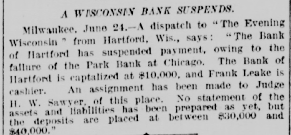 A WISCONSIN BANK SUSPENDS. Milwankee, June 24.-A dispatch to "The Evening Wisconsin from Hartford, Wis., says: "The Bank of Hartford has suspended payment, owing to the failure of the Park Bank at Chicago. The Bank of Hartford is captalized at $10,000, and Frank Leake is cashier. An assignment has been made to Judge 11. W. Sawyer, of this place. No statement of the assets and liabilities has been prepared as yet, but the deposits are placed at between $30,000 and $40,000."