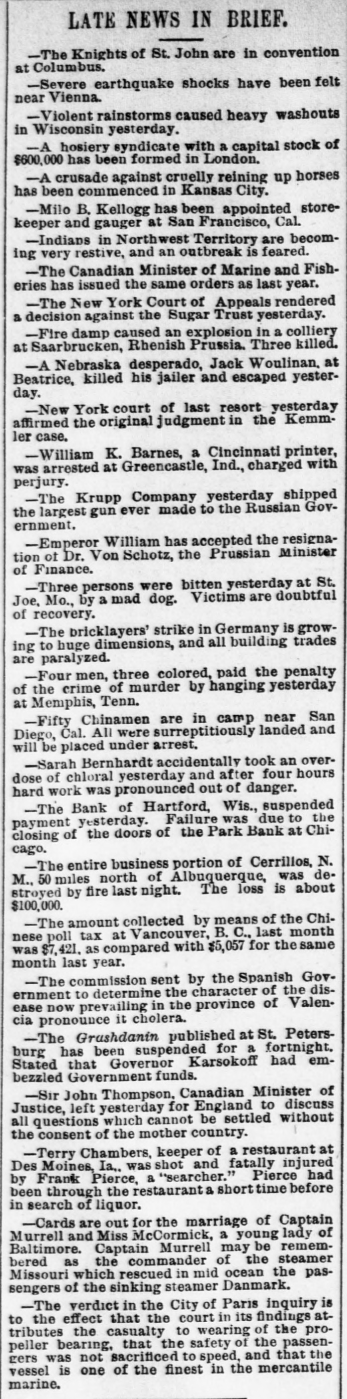 LATE NEWS IN BRIEF. -The Knights of St. John are in convention at Columbus. -Severe earthquake shocks have been felt near Vienna. -Violent rainstorms caused heavy washouts in Wisconsin yesterday. -A hosiery syndicate with a capital stock of $600,000 has been formed in London. -A crusade against cruelly reining up horses has been commenced in Kansas City. -Milo B. Kellogg has been appointed storekeeper and gauger at San Francisco, Cal. -Indians in Northwest Territory are becoming very restive, and an outbreak is feared. -The Canadian Minister of Marine and Fisheries has issued the same orders as last year. -The New York Court of Appeals rendered a decision against the Sugar Trust yesterday. -Fire damp caused an explosion in a colliery at Saarbrucken, Rhenish Prussia. Three killed. -A Nebraska desperado, Jack Woulinan. at Beatrice, killed his jailer and escaped yesterday. -New York court of last resort yesterday affirmed the original judgment in the Kemmler case. -William K. Barnes, a Cincinnati printer, was arrested at Greencastle, Ind., charged with perjury. -The Krupp Company yesterday shipped the largest gun ever made to the Russian Government. -Emperor William has accepted the resignation ot Dr. Von Schotz, the Prussian Minister of Finance. -Three persons were bitten yesterday at St. Joe, Mo., by a mad dog. Victims are doubtful of recovery. -The bricklayers' strike in Germany is growing to huge dimensions, and all building trades are paralyzed. -Four men, three colored, paid the penalty of the crime of murder by hanging yesterday at Memphis, Tenn. -Fifty Chinamen are in camp near San Diego, Cal. All were surreptitiously landed and will be placed under arrest. -Sarah Bernhardt accidentally took an overdose of chloral yesterday and after four hours hard work was pronounced out of danger. -The Bank of Hartford, Wis., suspended payment yesterday. Failure was due to the closing of the doors of the Park Bank at Chicago. -The entire business portion of Cerrillos, N. M., 50 miles north of Albuquerque, was destroyed by fire last night. The loss is about $100,000. -The amount collected by means of the Chinese poll tax at Vancouver, B. C., last month was $7,421. as compared with $5,057 for the same month last year. -The commission sent by the Spanish Government to determine the character of the disease now prevailing in the province of Valencia pronounce it cholera. -The Grushdanin published at St. Petersburg has been suspended for a fortnight. Stated that Governor Karsokoff had embezzled Government funds. -Sir John Thompson, Canadian Minister of Justice, left yesterday for England to discuss all questions which cannot be settled without the consent of the mother country. -Terry Chambers, keeper of a restaurant at Des Moines, Ia., was shot and fatally injured by Frank Pierce, a "searcher." Pierce had been through the restaurant a short time before in search of liquor. -Cards are out for the marriage of Captain Murrell and Miss McCormick, a young lady of Baltimore. Captain Murrell may be remembered as the commander of the steamer Missouri which rescued in mid ocean the passengers of the sinking steamer Danmark. -The verdict in the City of Paris inquiry is to the effect that the court in its findings attributes the casualty to wearing of the propeller bearing, that the safety of the passengers was not sacrificed to speed, and that the vessel is one of the finest in the mercantile marine.