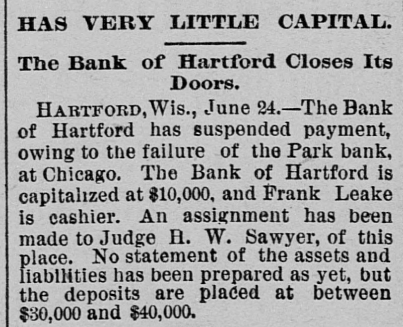 HAS VERY LITTLE CAPITAL. The Bank of Hartford Closes Its Doors. HARTFORD, Wis., June 24.-The Bank of Hartford has suspended payment, owing to the failure of the Park bank, at Chicago. The Bank of Hartford is capitalized at $10,000, and Frank Leake is cashier. An assignment has been made to Judge H. W. Sawyer, of this place. No statement of the assets and liabilities has been prepared as yet, but the deposits are placed at between $30,000 and $40,000.