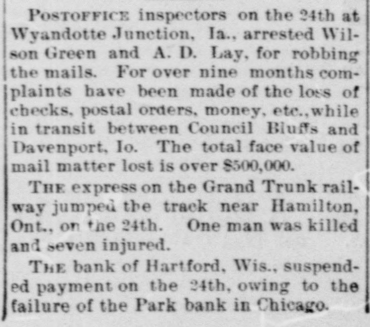 POSTOFFICE inspectors on the 24th at Wyandotte Junction, Ia., arrested Wilson Green and A.D. Lay, for robbing the mails. For over nine months complaints have been made of the loss of checks, postal orders, money, etc., while in transit between Council Bluffs and Davenport, Io. The total face value of mail matter lost is over $500,000. THE express on the Grand Trunk railway jumped the track near Hamilton, Ont., on the 24th. One man was killed and seven injured. THE bank of Hartford, Wis., suspended payment on the 24th, owing to the failure of the Park bank in Chicago.