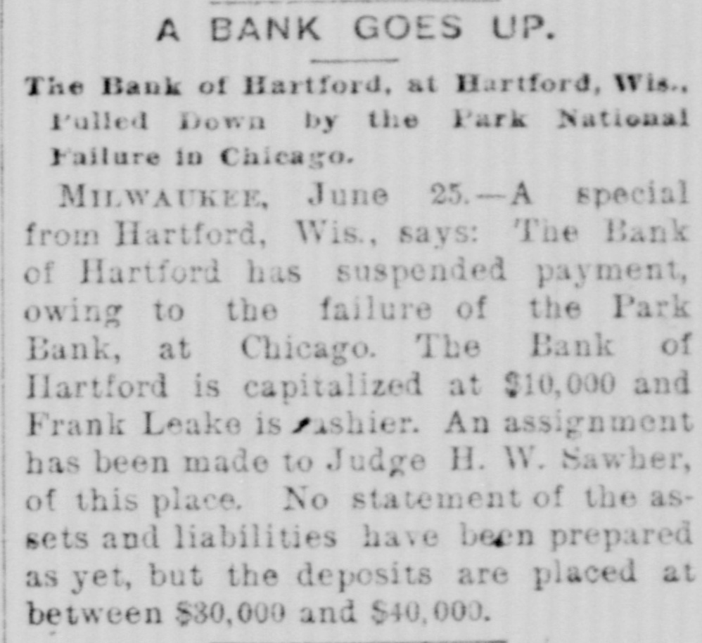 The Bank of Hartford (Hartford, Wis.) suspended payment on June 24, 1890, explicitly attributed to the failure/suspension of the Park (Park National) Bank of Chicago. An assignment was made to H. W. Sawyer (assignee), indicating a permanent failure/closure rather than a temporary suspension or reopening. December articles describe the institutions as private corporations operated by Cooke and Leake, supporting classification as a private bank.