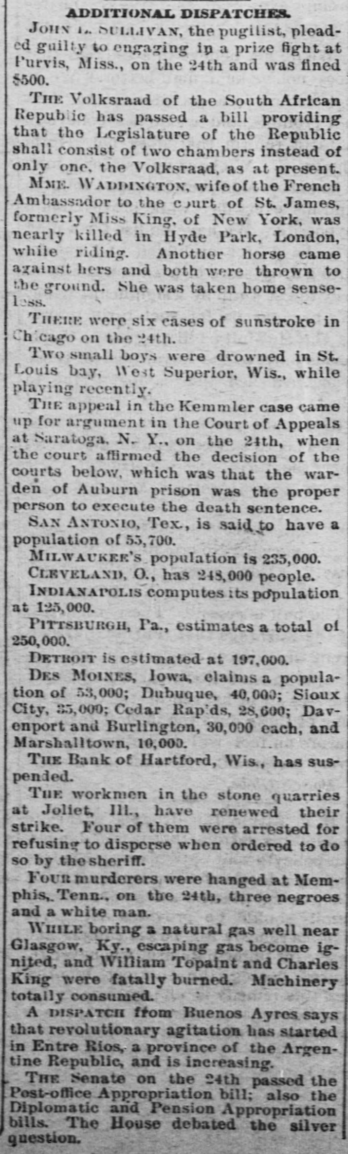 ADDITIONAL DISPATCHES JOHN 1. SULLIVAN, the pugilist, pleaded guilty to engaging in a prize fight at Purvis, Miss., on the 24th and was fined $500. THE Volksraad of the South African Republic has passed a bill providing that the Legislature of the Republic shall consist of two chambers instead of only one, the Volksraad, as at present. MME. WADDINGTON, wife of the French Ambassador to the court of St. James, formerly Miss King, of New York, was nearly killed in Hyde Park, London, while riding. Another horse came against hers and both were thrown to the ground. She was taken home senseless. THERE were six cases of sunstroke in Chicago on the 24th. Two small boys were drowned in St. Louis bay, West Superior, Wis., while playing recently. THE appeal in the Kemmler case came up for argument in the Court of Appeals at Saratoga, N. Y., on the 24th, when the court affirmed the decision of the courts below, which was that the warden of Auburn prison was the proper person to execute the death sentence. SAN ANTONIO, Tex, is said to have a population of 55,700. MILWAUKEE'S population is 235,000. CLEVELAND, 0., has 248,000 people. INDIANAPOLIS computes its population at 125,000. PITTSBURGH, Pa., estimates a total of 250,000. DETROIT is estimated at 197,000. DES MOINES, Iowa, claims a population of 53,000; Dubuque, 40,000; Sioux City, 35,000; Cedar Rapids, 28,600; Davenport and Burlington, 30,000 each, and Marshalltown, 10,000. THE Bank of Hartford, Wis., has suspended. THE workmen in the stone quarries at Joliet, III., have renewed their strike. Four of them were arrested for refusing to disperse when ordered to do so by thesheriff. Four murderers were hanged at Memphis, Tenn., on the 24th, three negroes and a white man. WHILE boring a natural gas well near Glasgow, Ky., escaping gas become ignited, and William Topaint and Charles King were fatally burned. Machinery totally consumed. A DISPATCH from Buenos Ayres says that revolutionary agitation has started in Entre Rios, a province of the Argentine Republic, and is increasing. THE Senate on the 24th passed the Post-office Appropriation bill; also the Diplomatic and Pension Appropriation bills. The House debated the silver question.
